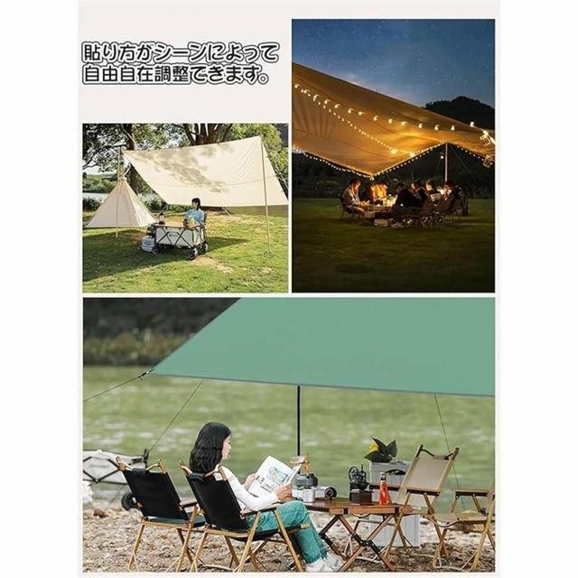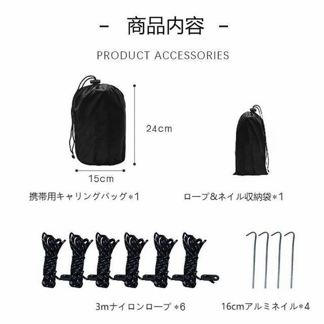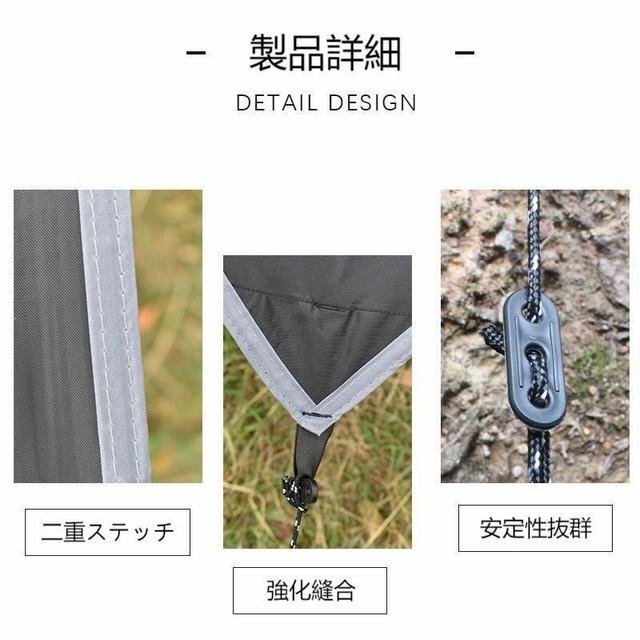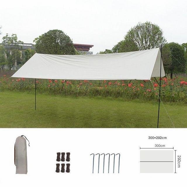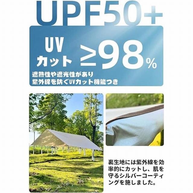 サイズ:300x300cm。防水仕様:生地には高耐水加工が施されており、耐水圧はなんと3000mm以上! 大抵の雨には対応できます! 遮光遮熱 :生地の裏面には紫外線から守るシルバーのコーティングが施されていますので、優れたUVカット、真夏の暑さ、紫外線から守る。 アウトドア、レジャーなど屋外で使用するには最適。 軽量デザイン&コンパクト収納:アウトドア初心者でも安心の簡単組み立て! 複雑なフレームの組み立てがなく、女性同士でもあっという間に設置することができます。テントとタープを連結設営すると、居住スペースが大幅に広がります。雨の日でも濡れずにテントとタープ間を行き来できます。 様々なシーンで活躍:レジャー、海・山・川でのキャンプやバーベキューはもちろん、ヤード、中庭、運動会やピクニ、ク、野外フェスまで、使いどころ満載の防水タープテント。 あらゆるレジャーシーンで活躍すること間違いなしです。