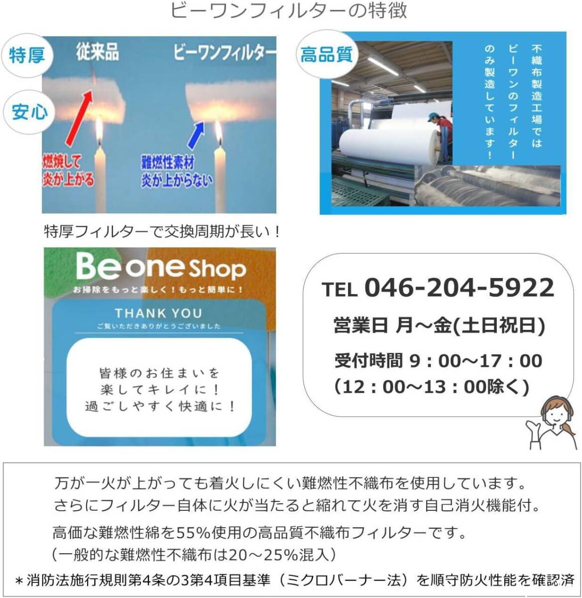 フィルターは、日本国内で製造・成型している100%JAPANクオリティ。ミクロバーナー法を遵守し、ポリエステル100%でも炎が燃え広がらない防炎性能を確認済です。