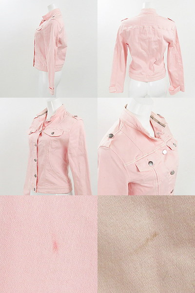 | イチゴミルクカラーが女心くすぐるジャケット☆ 方や胸ポケットに付いたシルバー色のロゴ入りボタンがいいアクセント になり、細身のスタイルでかっこいい女性になれますよ♪ カジュアルスタイルや、シンプルスタイルに差し色として、 入れていただきたい一枚です! 薄めの生地なので、春先から秋口にかけて活躍してくれますよ。 背中、右肩下部分に薄い汚れがございます。BR> 着丈約50㎝ 袖丈約47㎝ 肩幅約36㎝ バスト約80㎝ 【サイズ】:(D36) 【素 材】:(コットン98%・ スパンデックス2%) 【 色 】:(ピンク) 【程 度】:(B) 20090525-003 238 003 | ||||