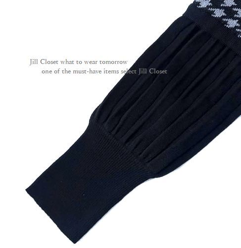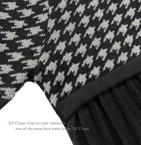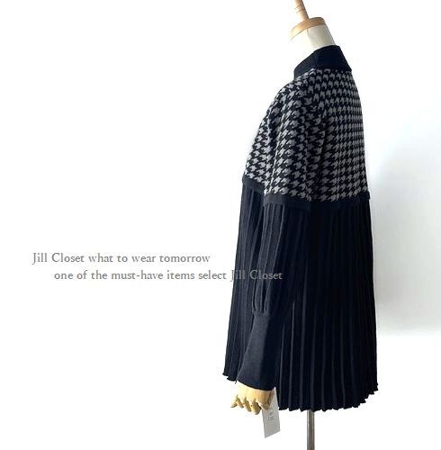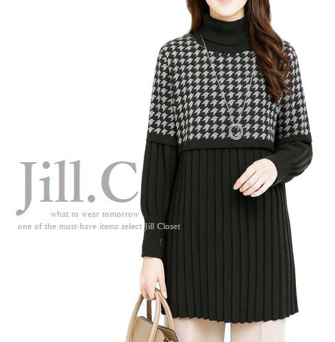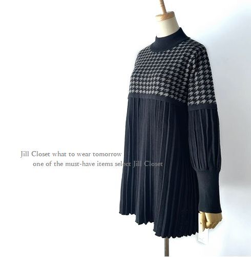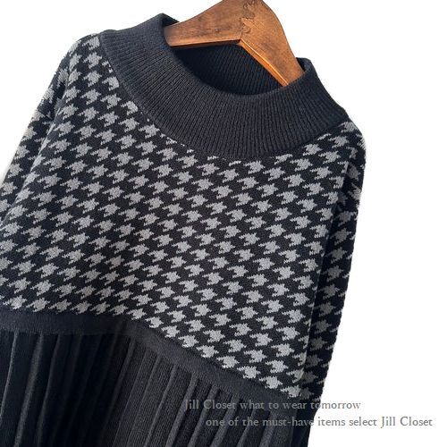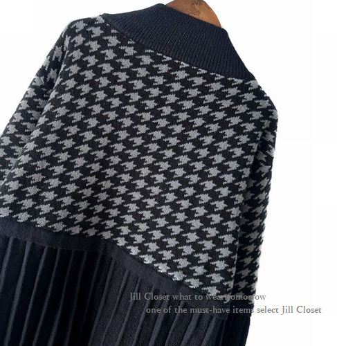 千鳥柄&プリーツ加工ニットチュニック。ネック・袖口はリブ仕様。通勤オフィス対応・コート下にも最適な優秀アイテム。