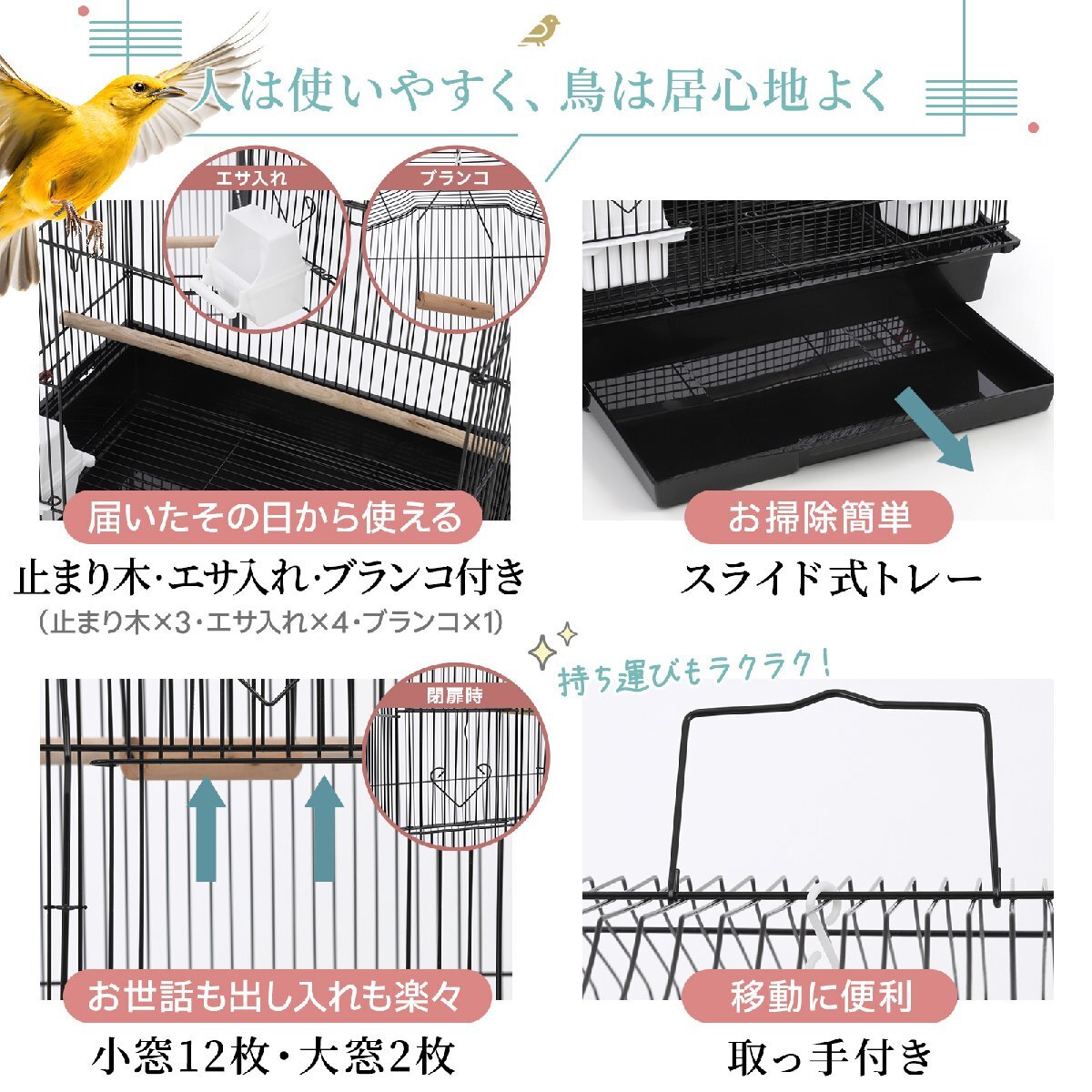 商品名:鳥かご バードケージ 鳥小屋 複数飼い 大きいケージ 大型 インコ セキセイインコ オカメインコ 文鳥 小鳥 ケージ ゲージ 93×46×36cm黒 底網付きで、トレーは引き出し式のため掃除がカンタン。 カナリヤやセキセイインコなどの小鳥の多数飼育でも広々。オカメインコなどでもたくさん飼育できます。 4つのプラスチック製エサ入れと3本の木製止まり木、ブランコ、 2枚の大窓で鳥の出し入れがしやすく、隅々までお掃除可能! 12枚の小窓で小物の配置も自由自在。 持ち手付きでお手軽に移動できます。 組立説明書をお付けいたしますので簡単にご使用いただけます。 ●製品仕様 サイズ(約):高さ93×幅46×奥行き36cm、 重さ4.7kg 付属品: 鳥かご本体(スチール製) トレー(プラスチック) 止まり木:3本 プラスチック製のエサ(水)入れ:4個 ブランコ:1個 固定用ロック:2個 組み立て説明書 |