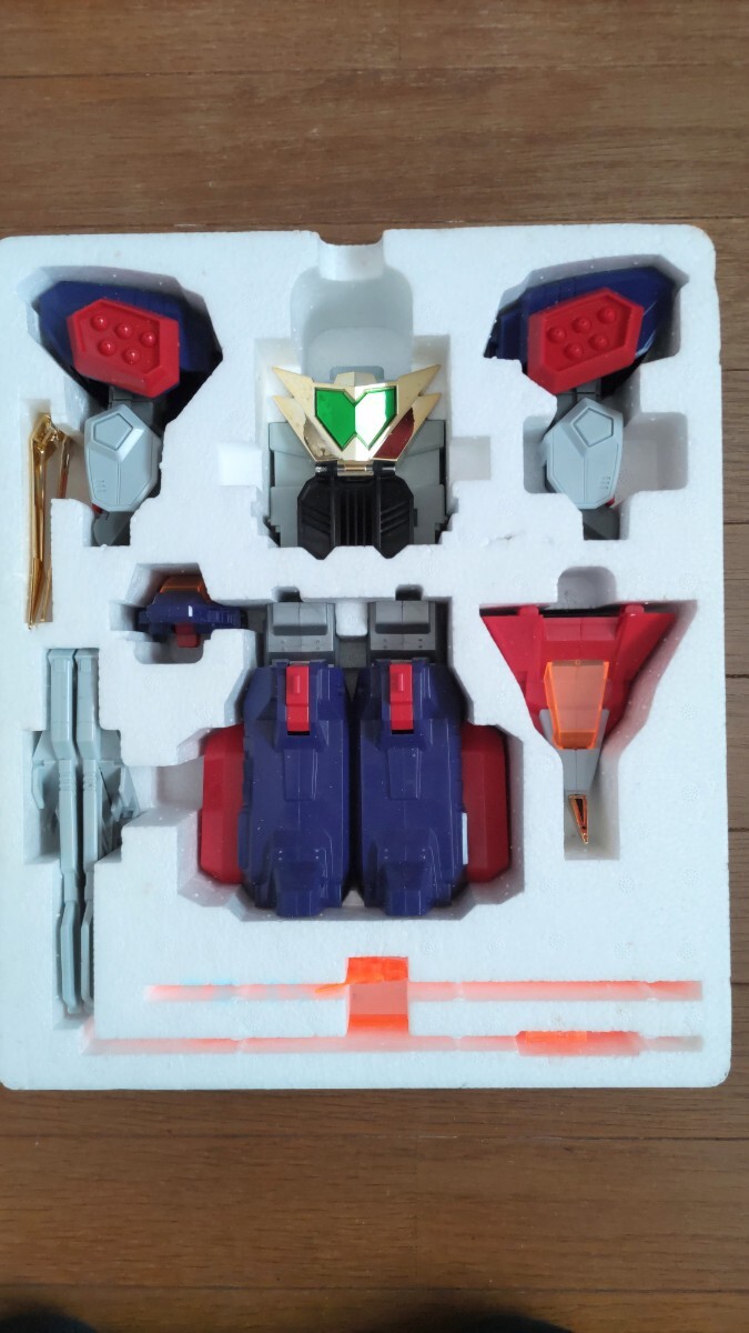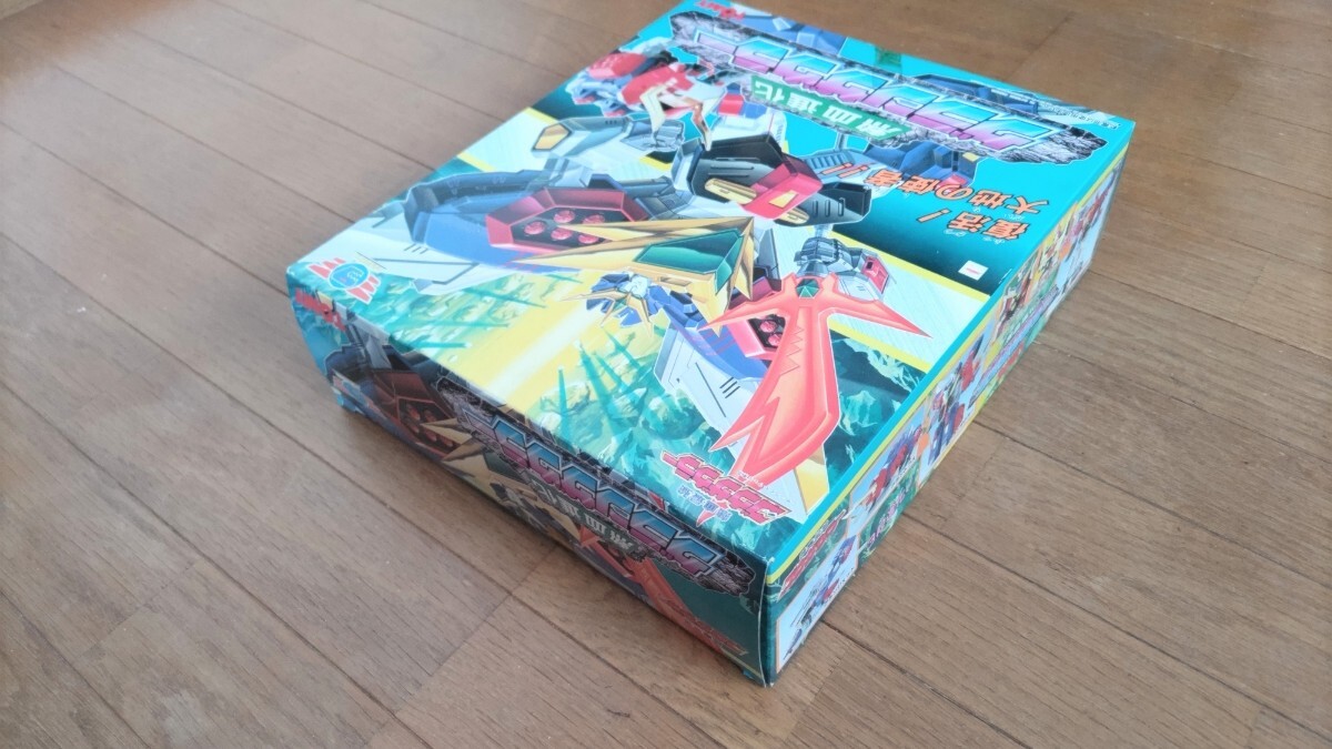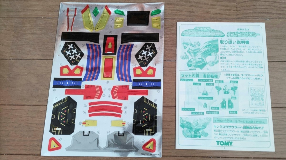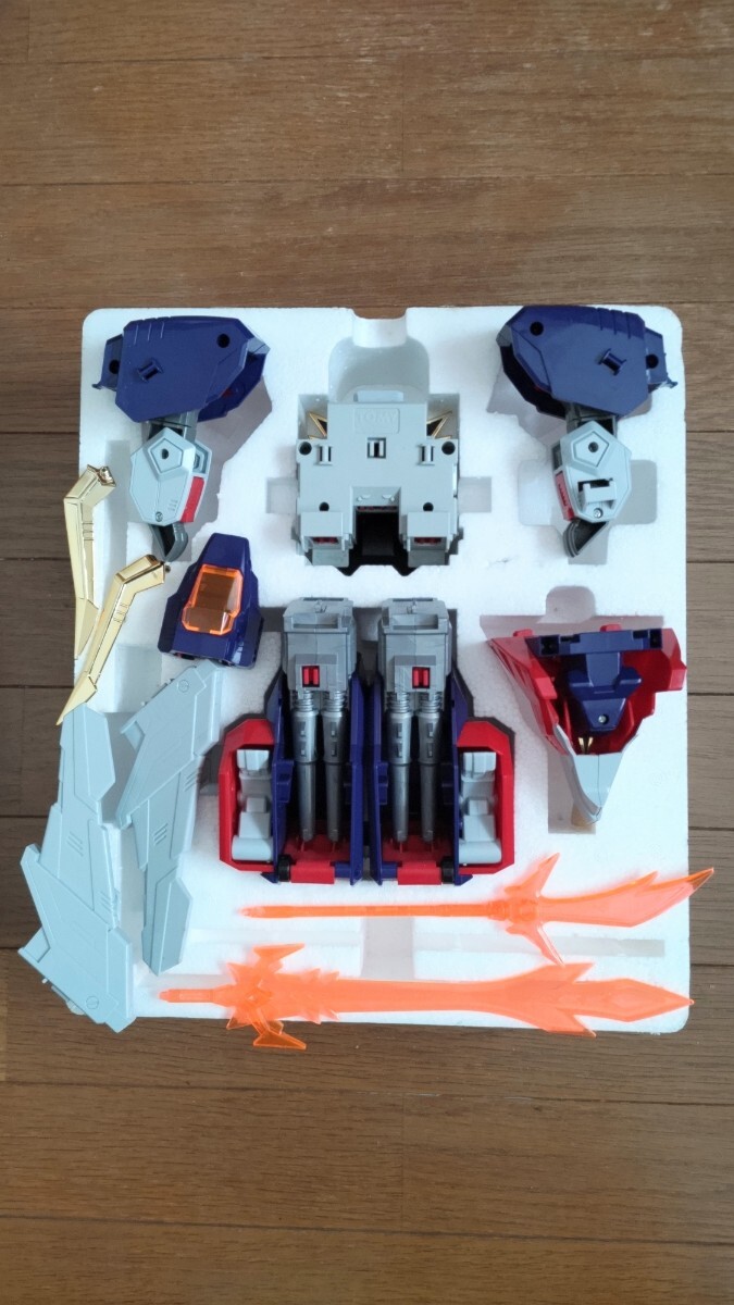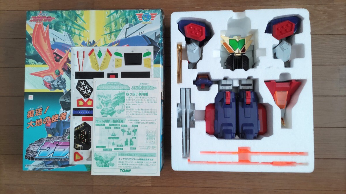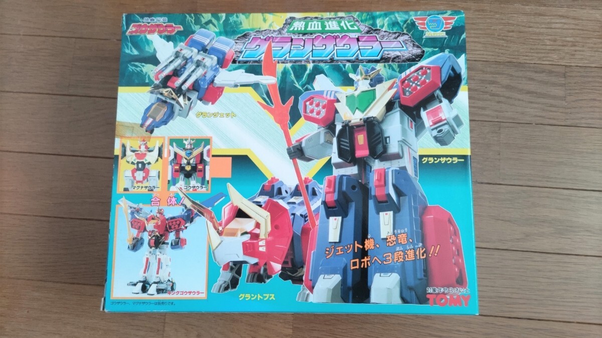 当時購入後内容確認のため一度だけ開封し、その後は長期間自宅で保管していました。出品に伴い久々に開封して撮影しました。グランジェット、グラントプス(トリケラトプス型)に三段変形し、さらにゴウザウラー(出品中)+マグナザウラー(出品中)と超熱血合体してキングゴウザウラーになります。