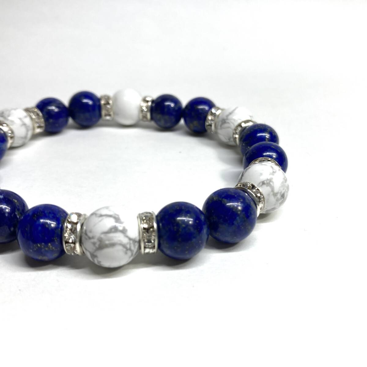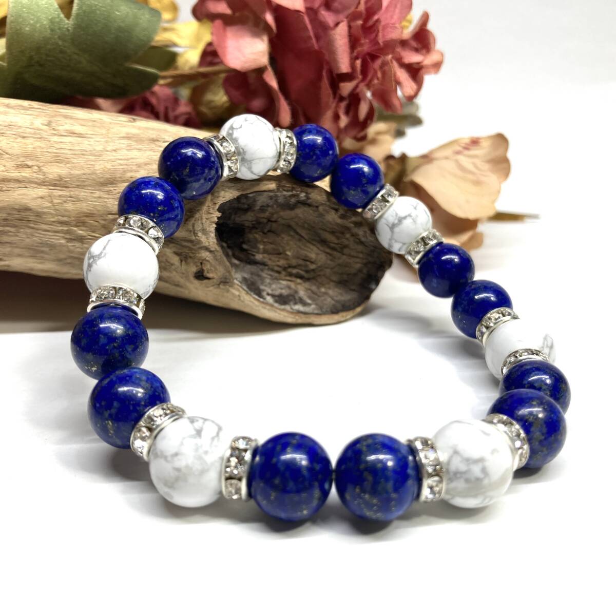 こちらは、ラピスラズリとハウライトを組み合わせたパワーストーンブレスレットです。間にはロンデルを挟み高級感あるデザインに仕上げております。石大きさは腕にも馴染みやすいように10mm玉で内径約18cm(伸可能)です。(サイズ変更の場合は取引ナビにてご連絡をお願いします。) 数に限りがございますので気になる方はお早めにどうぞ。