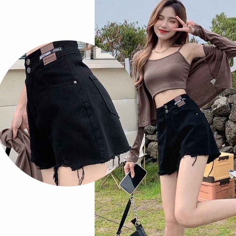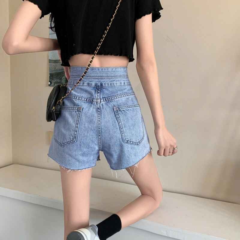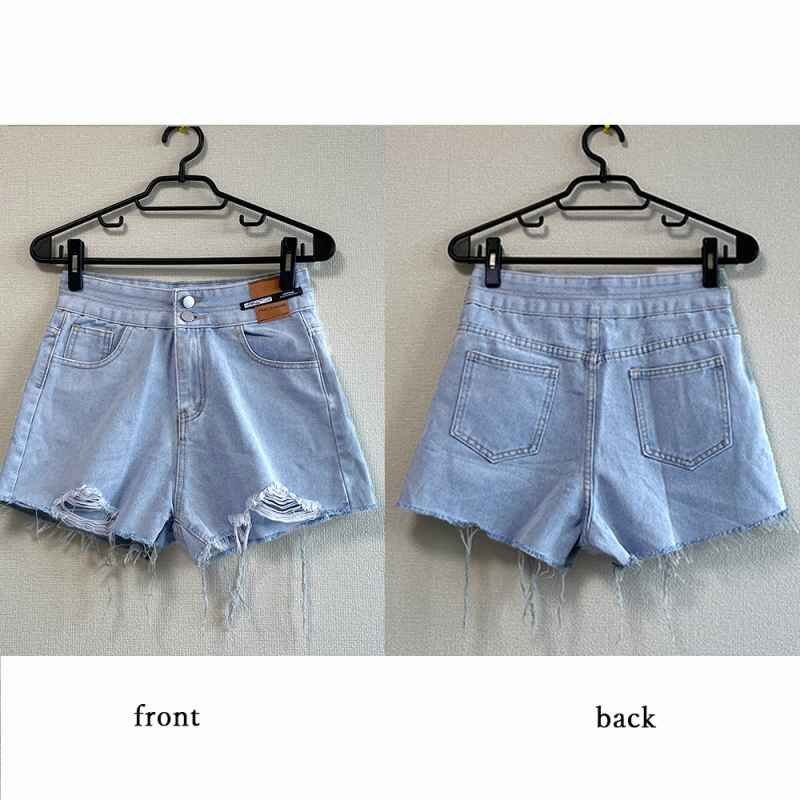 大人カジュアルスタイルのカットオフダメージデニムショートパンツ