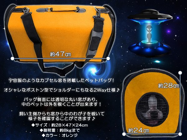 キャリーバッグ 宇宙船カプセル型♪ 2way ペットバッグ 犬猫兼用 オレンジ ボストンバッグ ショルダーバッグ ペットキャリー