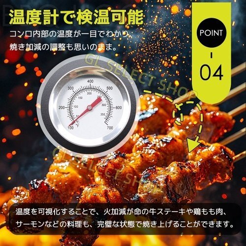 • 【温度計で検温可能】コンロ内部の温度が一目でわかり、焼き加減の調整も思いのまま。温度を可視化することで、火加減が命の牛ステーキや鶏もも肉、サーモンなどの料理も、完璧な状態で焼き上げることができます。焼き網 2枚付き 網を半分取り出すだけで開口部から簡単に炭の出し入れ可能です。これで、火力調節もやすいです。 キャンプ初心者もベテランも!BBQのストレスが激減