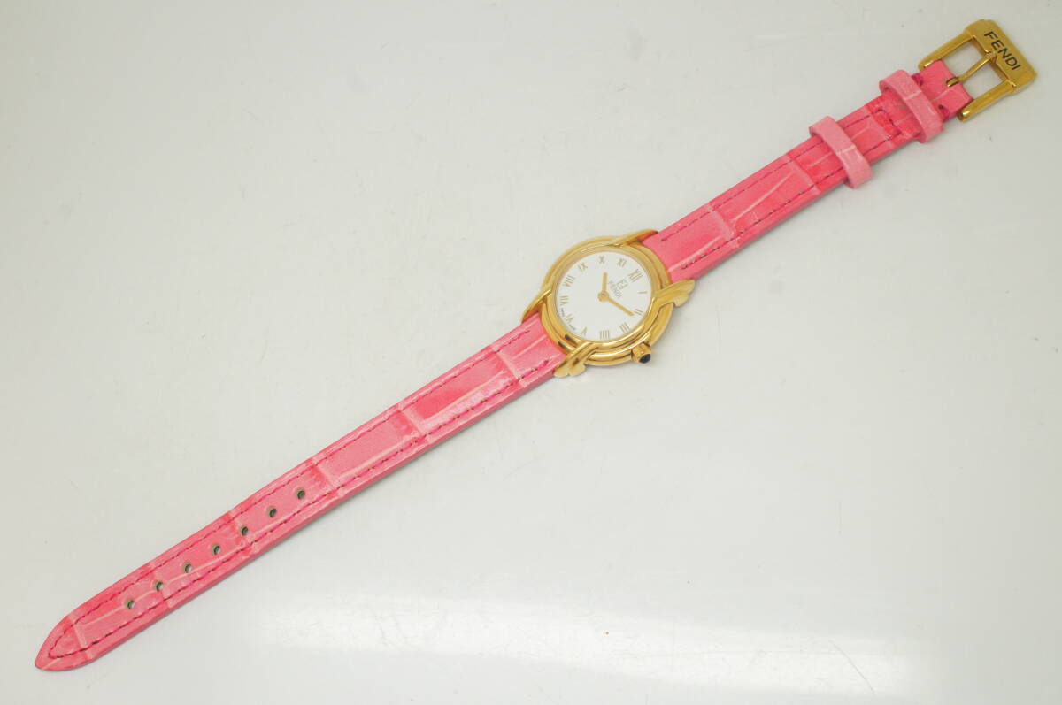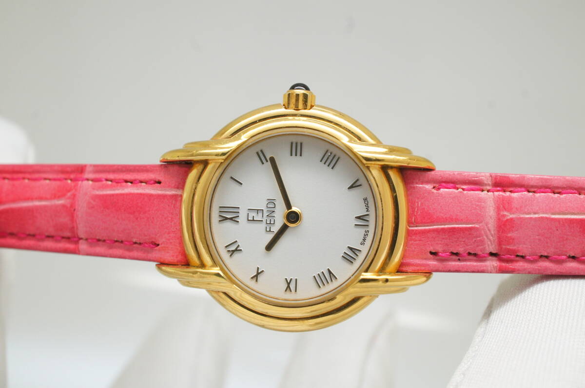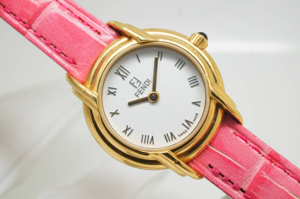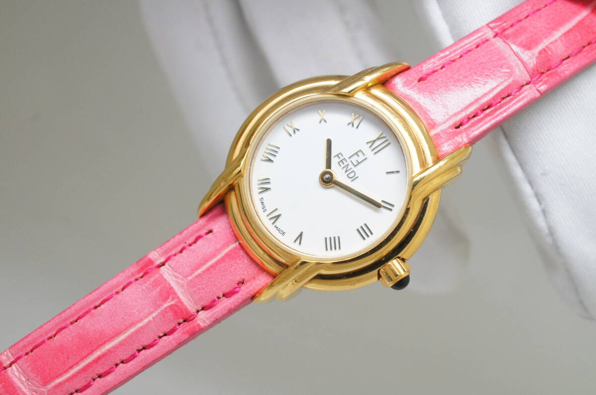 K156●作動良好 FENDI フェンディ スイス製 白文字盤 ローマン数字 純正尾錠 レディース腕時計 ゴールド金×ピンクベルト クォーツ