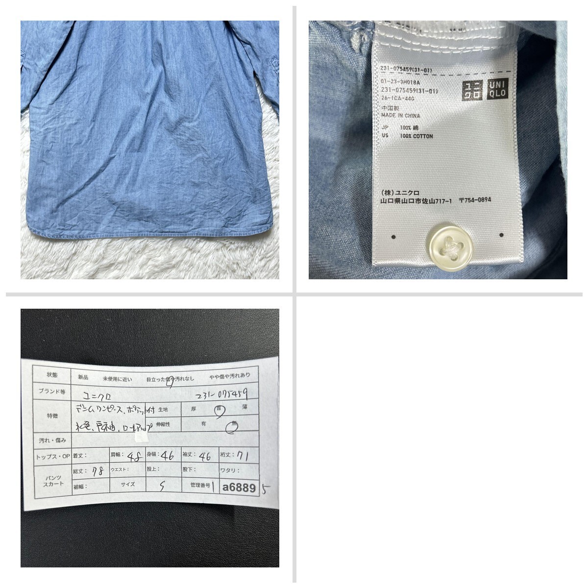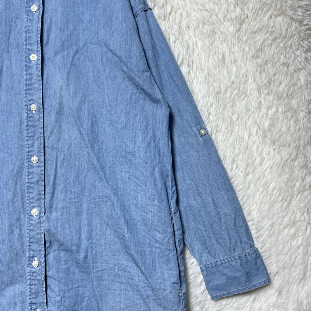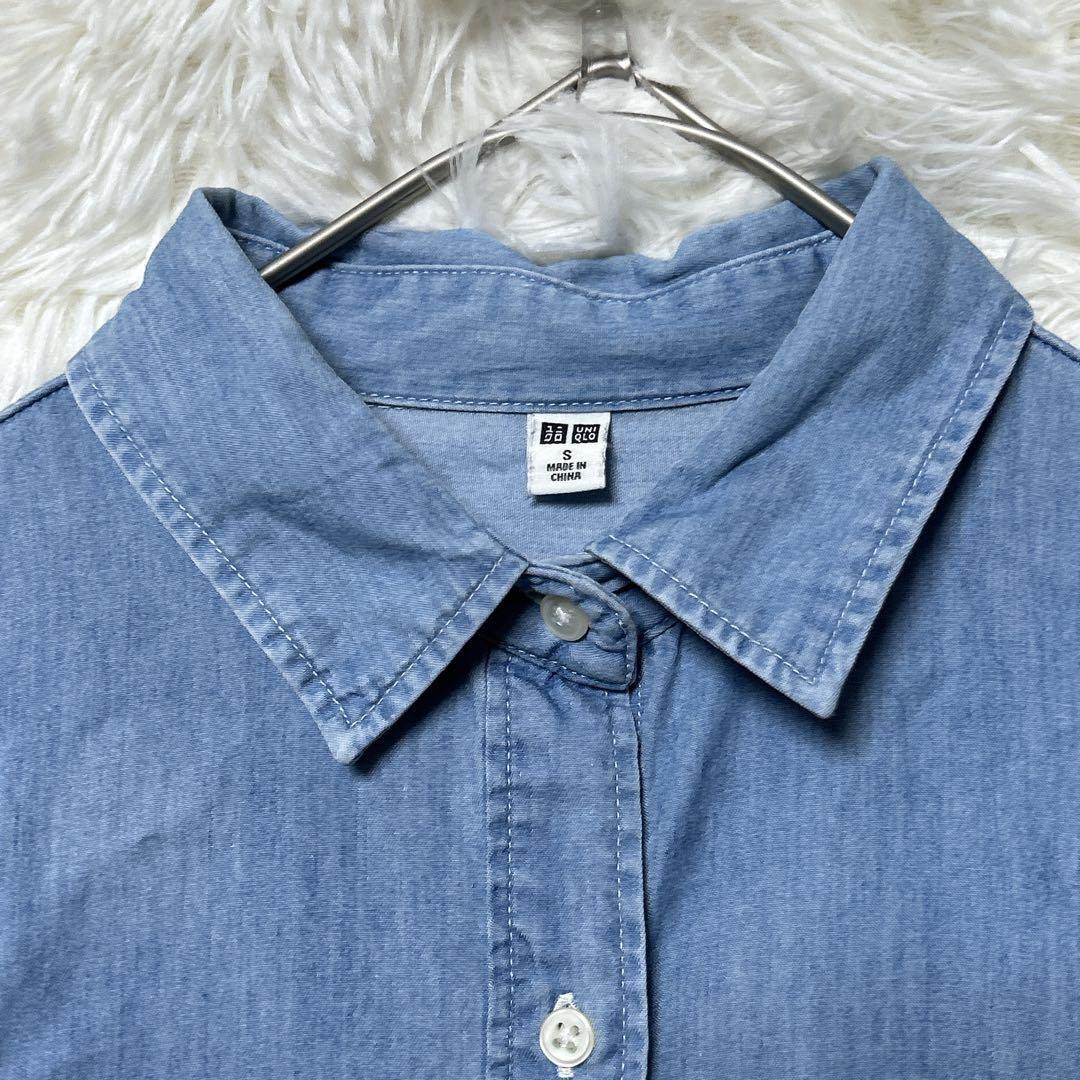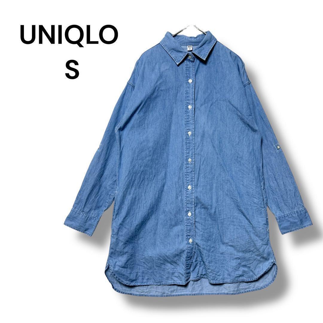 ユニクロ デニムワンピース ポケット付 S ロールアップ 長袖 ライトブルー 33454E
