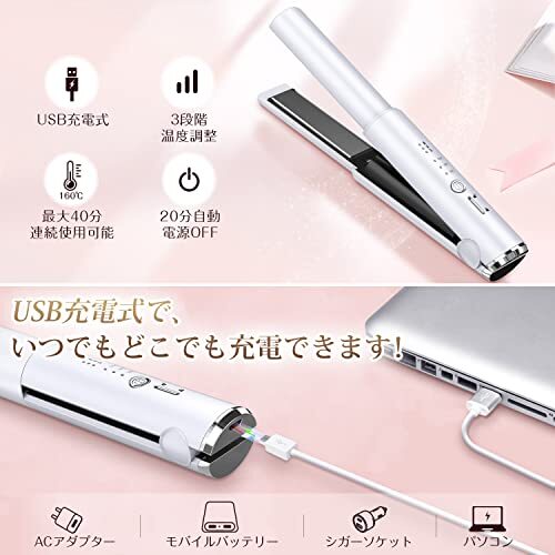 【コードレス ヘアアイロン】このストレートヘアアイロンは高品質リチウムイオン電池を内蔵し、1回のフル充電で最大40分(160℃の場合)連続使用可能です。「180℃ー30分、200℃ー20分、実際の使用時間は室温や使用状況によって異なります。」持ち運びに便利なコードレスタイプ、USB充電式でコンセント不要、学校や会社などでの急なヘアセットもOK。旅行や出張などに1つあると便利!バッグ収まるサイズ感だから常に持ち運びができる便利なアイテムです。「★★★ご注意:本製品は機内持ち込み不可です。」充電の際、必ずDC5V/2Aの充電器(別売り)を使ってください。