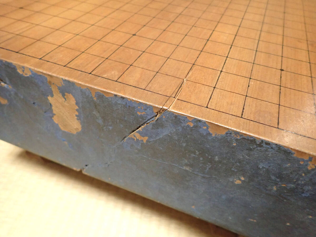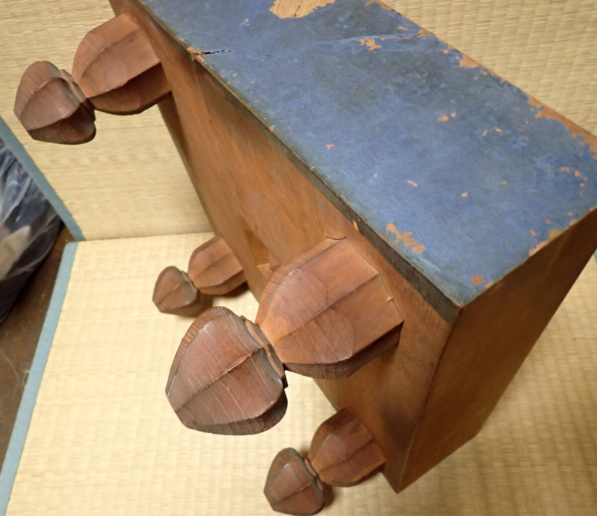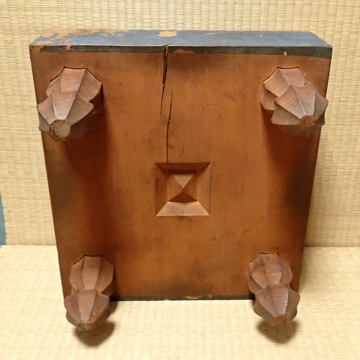 木の種類は不明です。 亀裂や脚のガタ付きがあります。 外寸:約44.8×41.8×H24.2cm 盤厚み:約12cm | |||