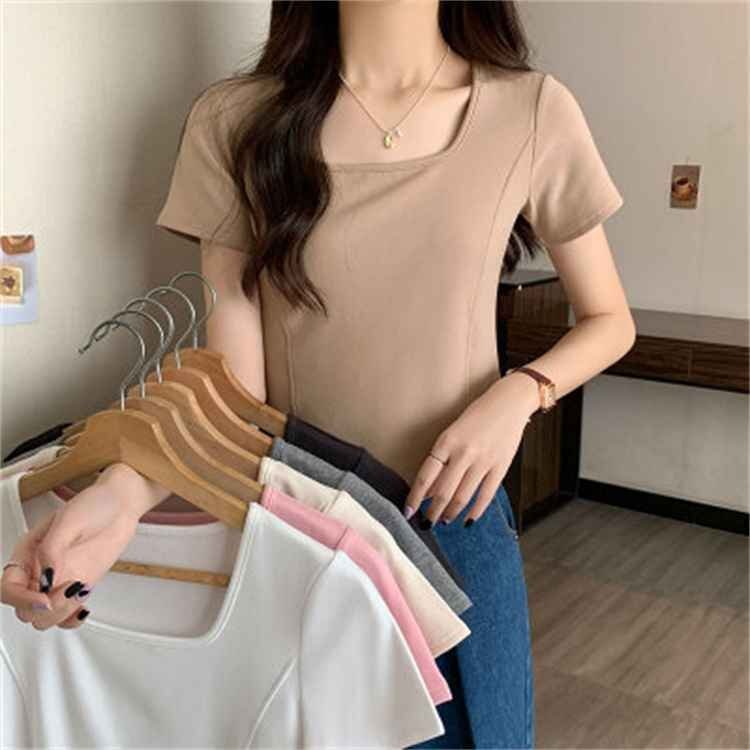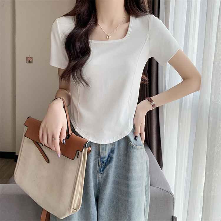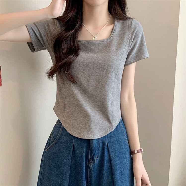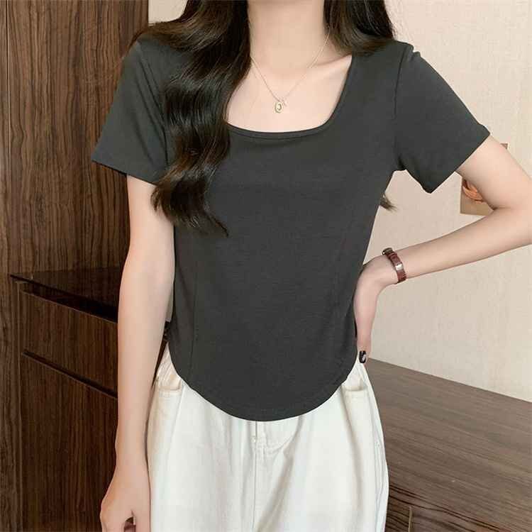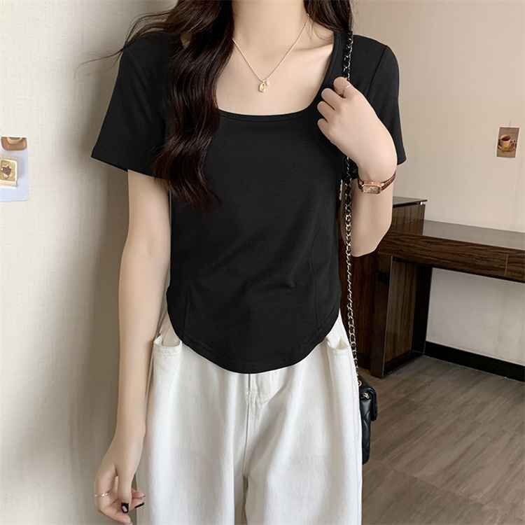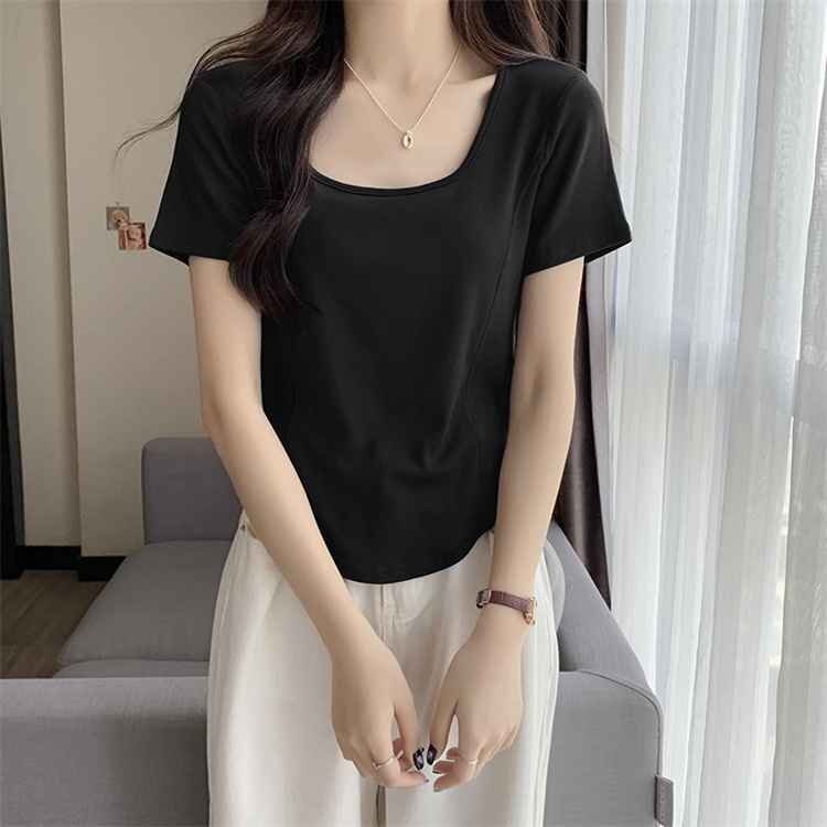 半袖 ショート丈 スクエアネック Tシャツ カジュアル 夏 大きいサイズあり XL ブラック(6,7枚目写真)