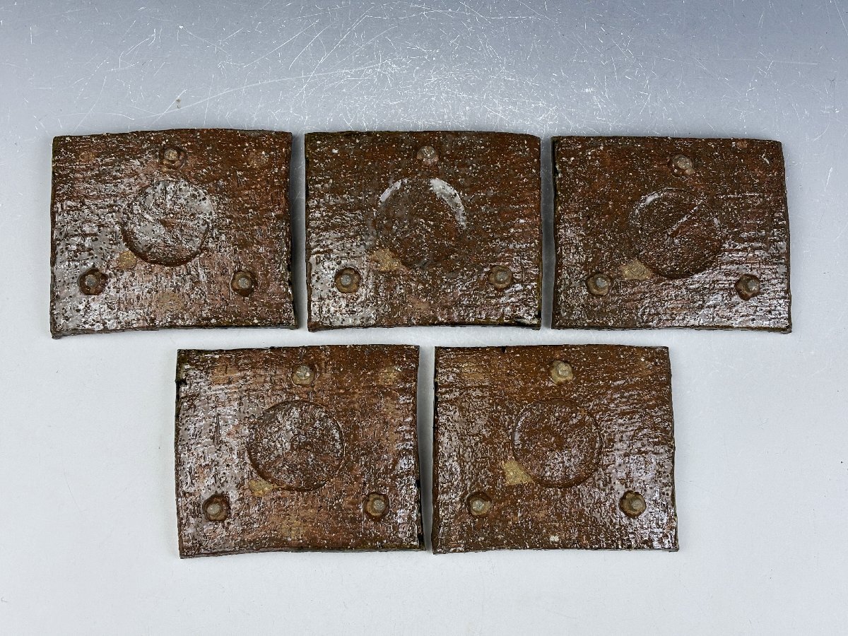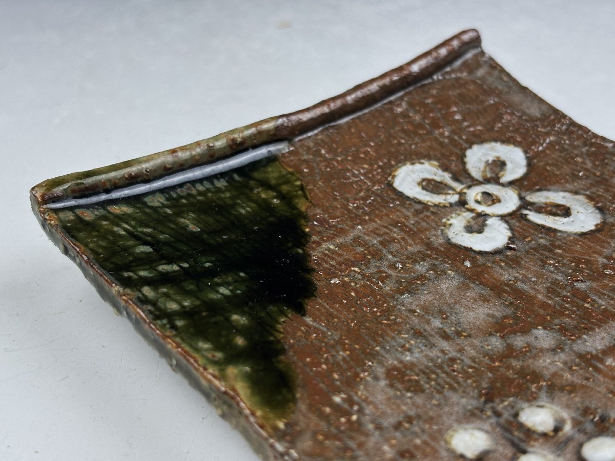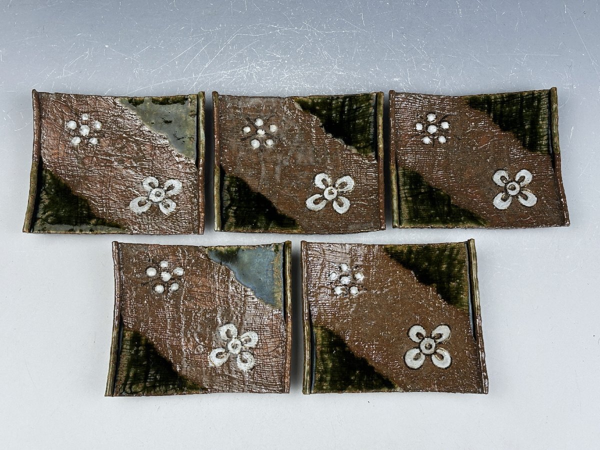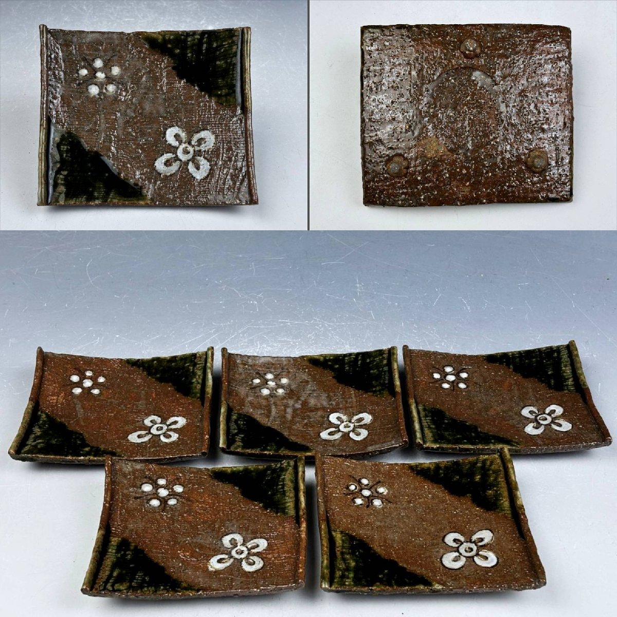 織部焼 瀬戸赤津 山口錠鉄 鉄釉 織部釉 花弁文 四方皿 角小皿 銘々皿 取皿 5客 無傷 懐石 和食器 茶道具 時代物 古陶磁器 古美術骨董品 FNT213