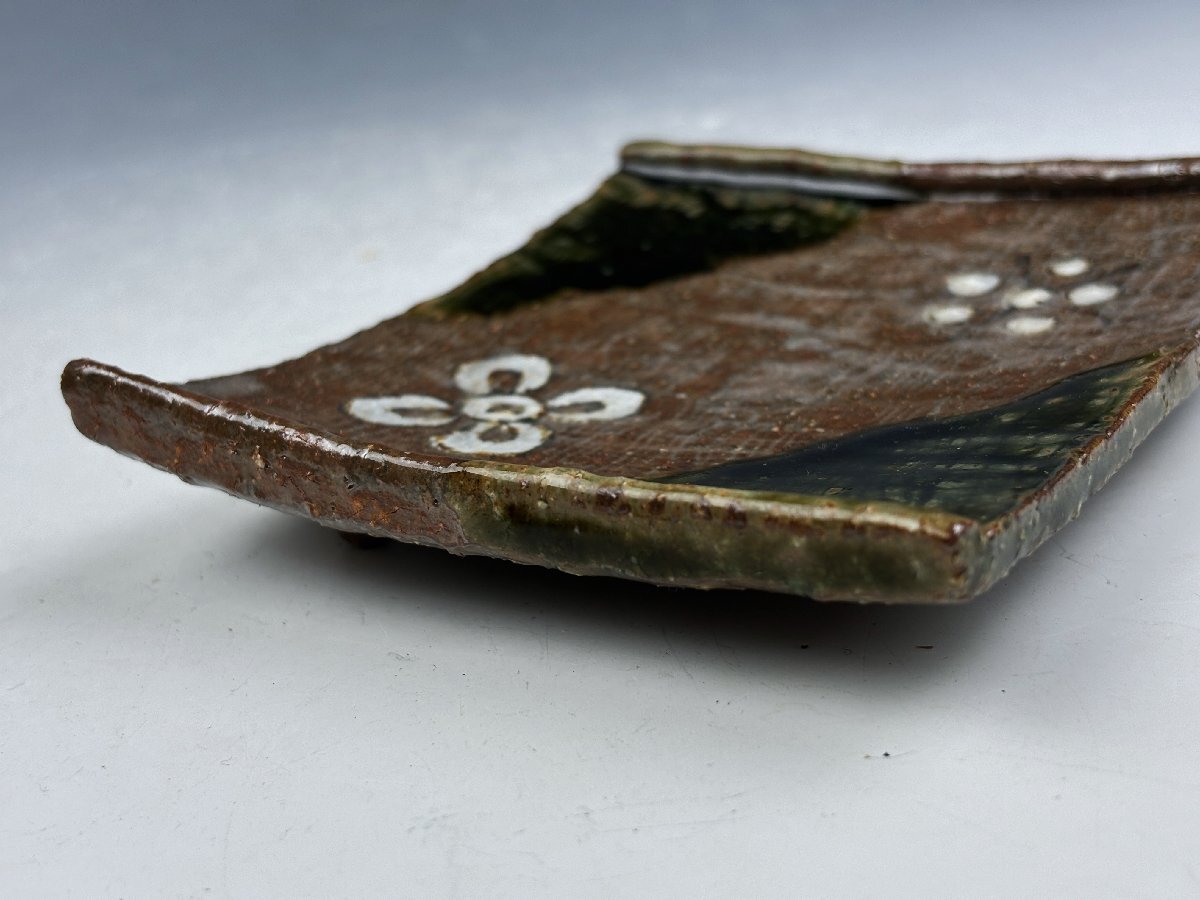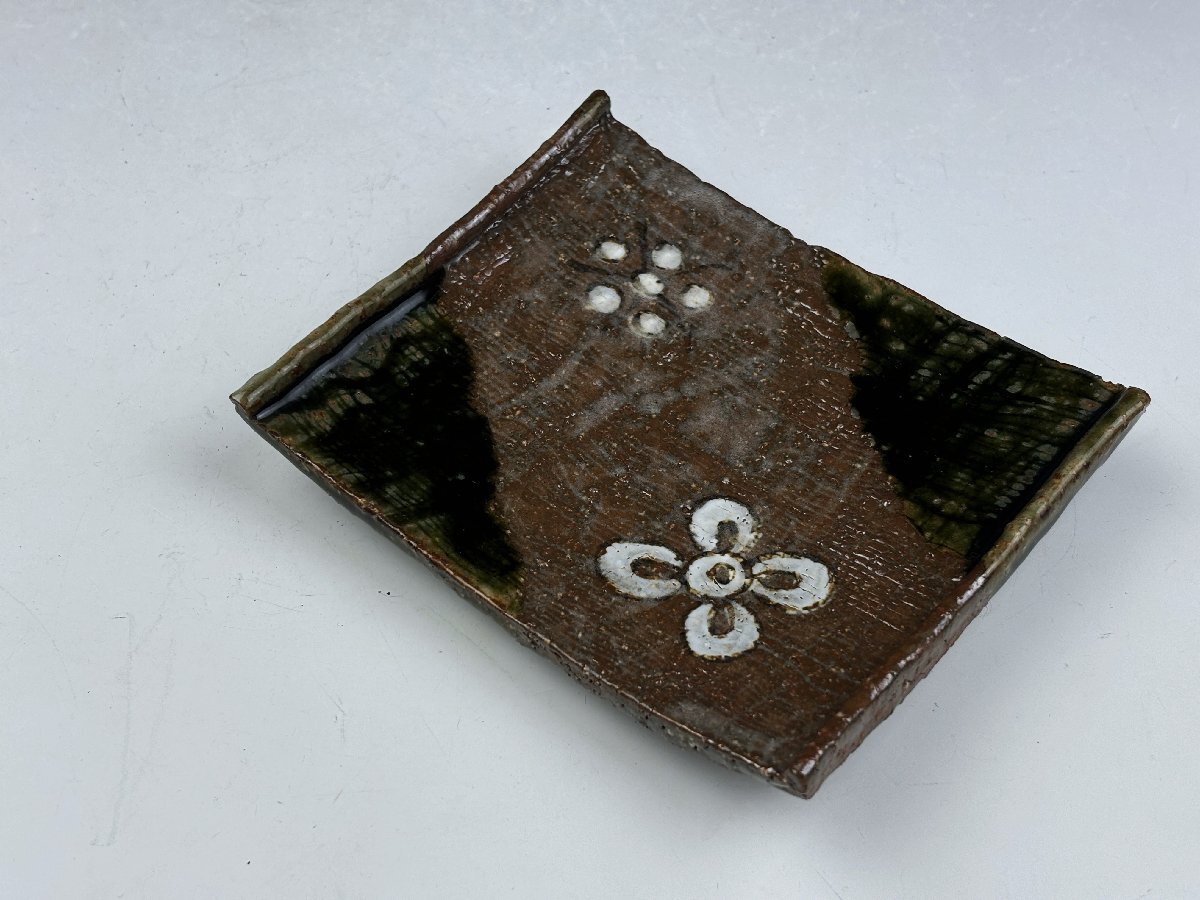 瀬戸赤津の名工 山口錠鉄造の角小皿5客です。鉄地の肌に織部釉掛けと白釉で花弁文が施された味わい深い絵付けの銘々皿です。