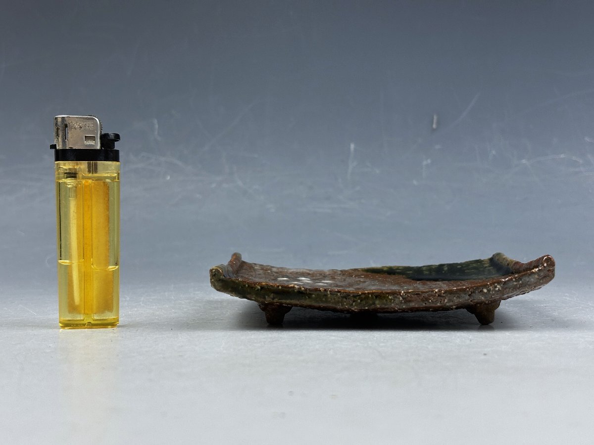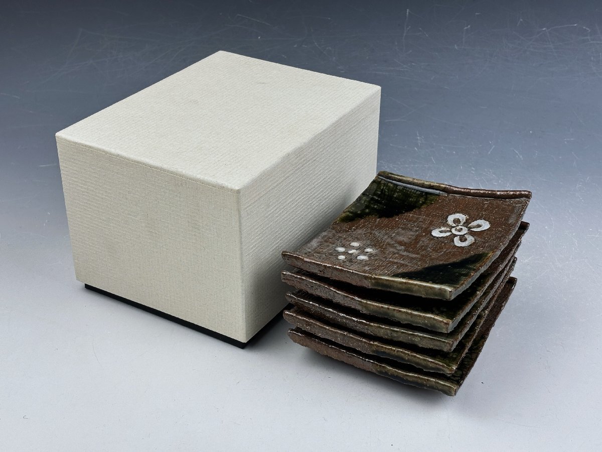 織部焼 山口錠鉄 鉄釉 織部釉 花弁文 四方皿 角小皿 銘々皿 取皿 5客 無傷 懐石 和食器 茶道具 古陶磁器 古美術骨董品 FNT213【遅日亭】