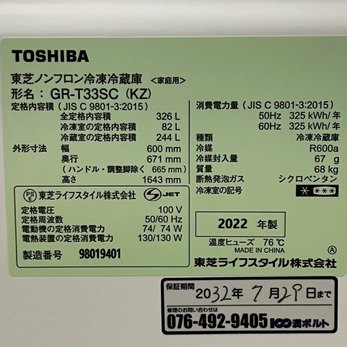 ・【TOSHIBA】東芝 3ドア ノンフロン冷凍冷蔵庫 GR-T33SC 326L 2022年製 動作確認済み 生活家電 右開き A0942