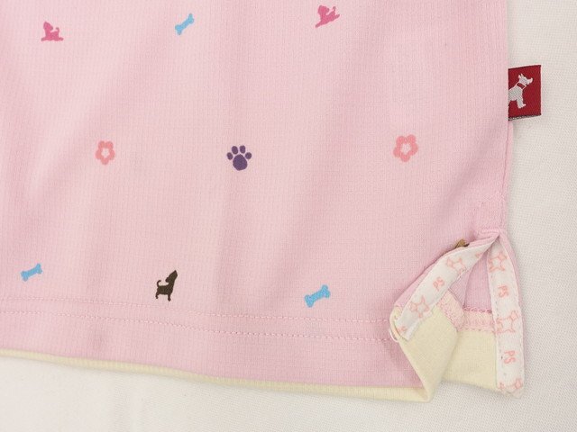 吸汗速乾に優れ、紫外線をしっかりガードしてくれるUVケア加工が施された生地が、アウトドア、スポーツ等にオケージョンにぴったり。犬と花モチーフのプリントがキュートな重ね着風カットソーです。新品タグ付き商品です。