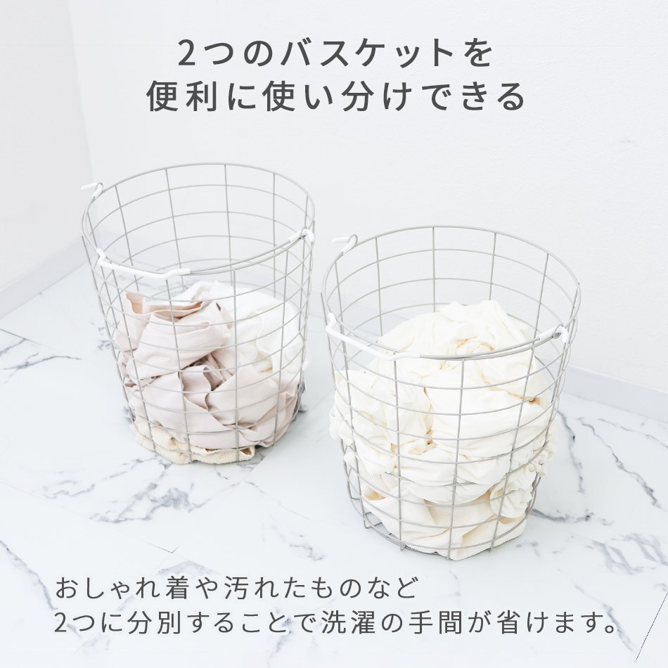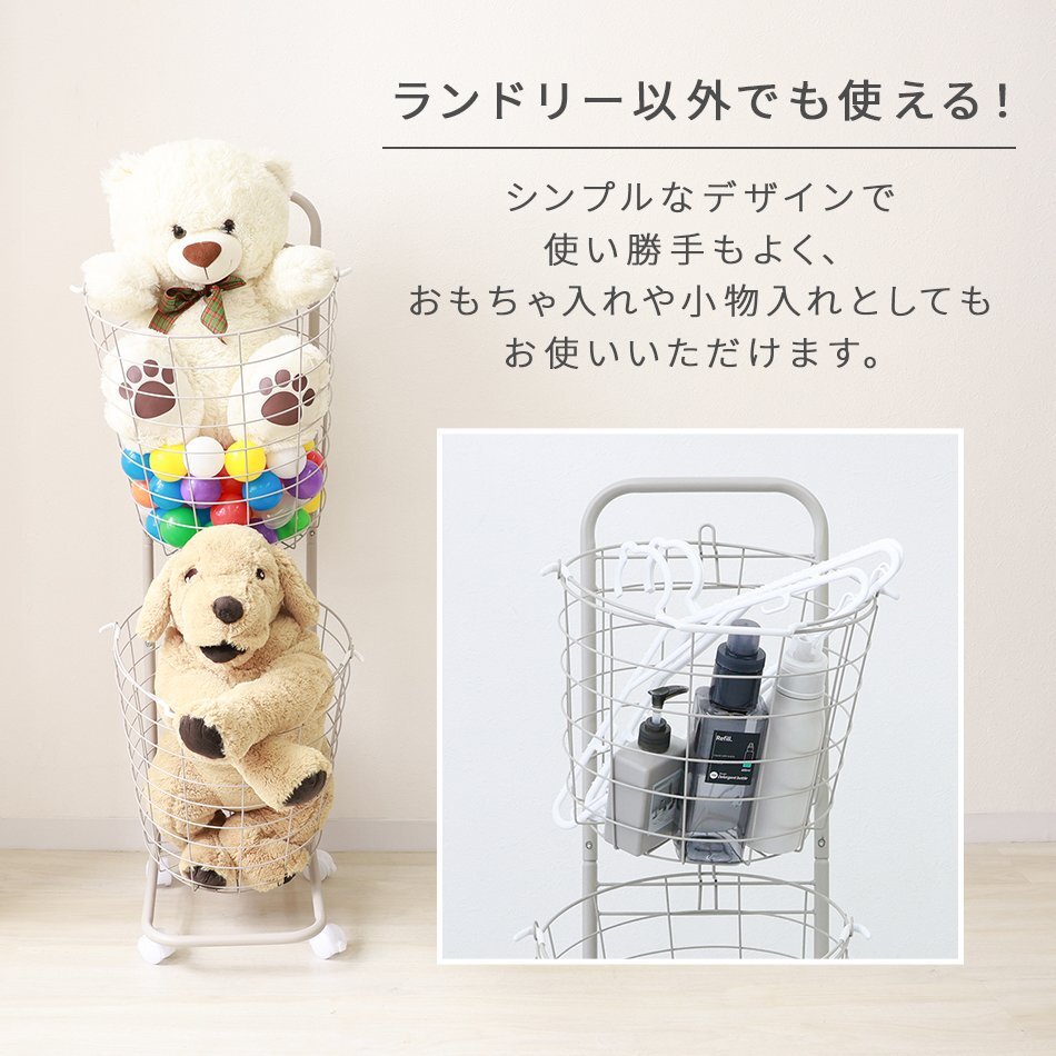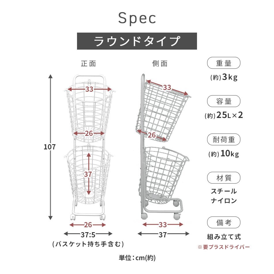 縦置き2段タイプ大容量「ランドリーバスケット」です。 2つのバスケットを縦に並べるので、 デッドスペースを活用でき物が多くなりがちなランドリー周りも無駄なくすっきり♪ バスケットは取り外し可能&持ち手付きで洗濯物の持ち運び・取り込みに便利です! また、キャスター付きでラックごとの移動もスムーズです。 通気性抜群のワイヤーフレーム採用! 嫌にニオイや湿気が溜まりにくく、カビ等も発生しにくいです。 ランドリー以外に食品ストッカー、雑貨入れ、おもちゃ収納としても大活躍です☆ 【商品仕様】 カラー:アースグレー 形:ラウンド(円形) サイズ(外寸):(約)幅37.5×高さ107×奥行37cm 重量(約):3kg 容量(約):25L×2 耐荷重(約):10kg(ラウンド・スクエア) 素材:スチール、ナイロン 商品コード:FAE001GYE |