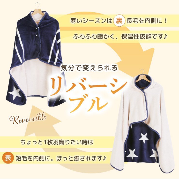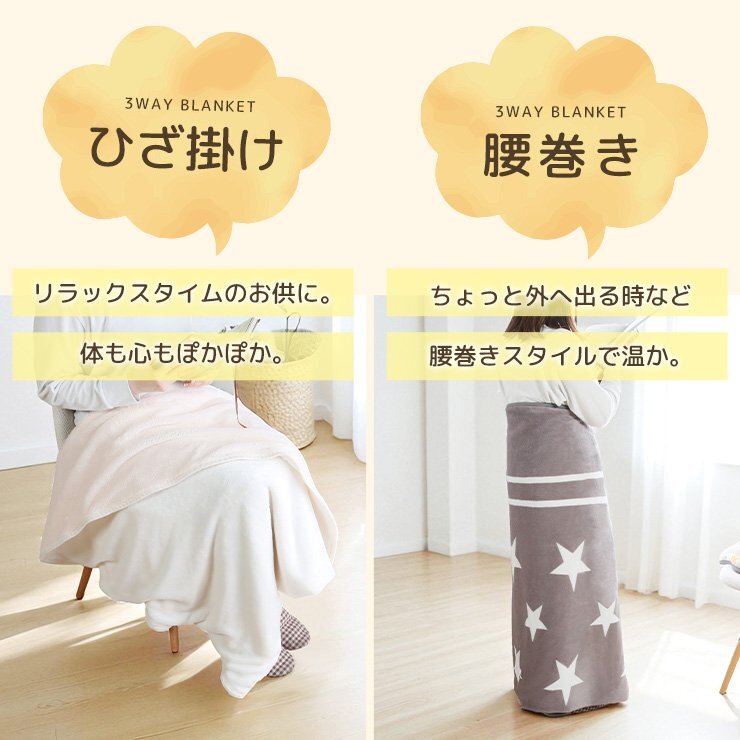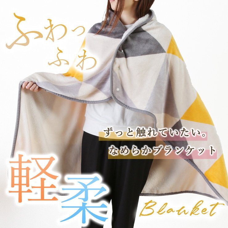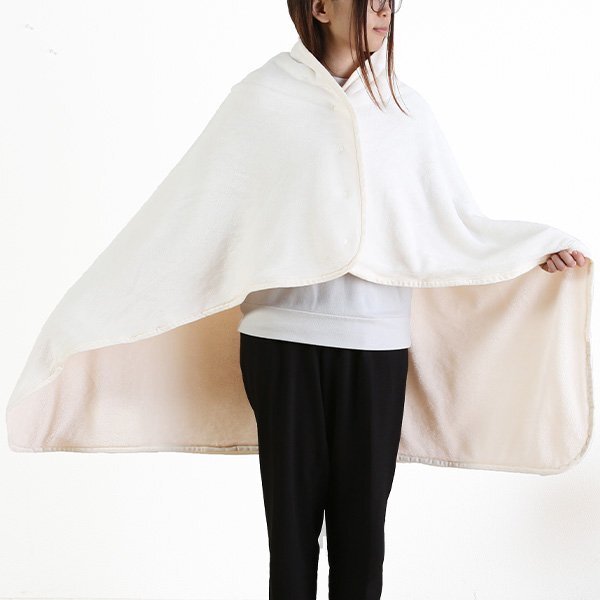 大判ブランケット 140×103cm ひざ掛け 腰巻き フランネル リバーシブル ボタン付き お洒落 軽量 洗える 毛布 ケット 防寒 アイボリー