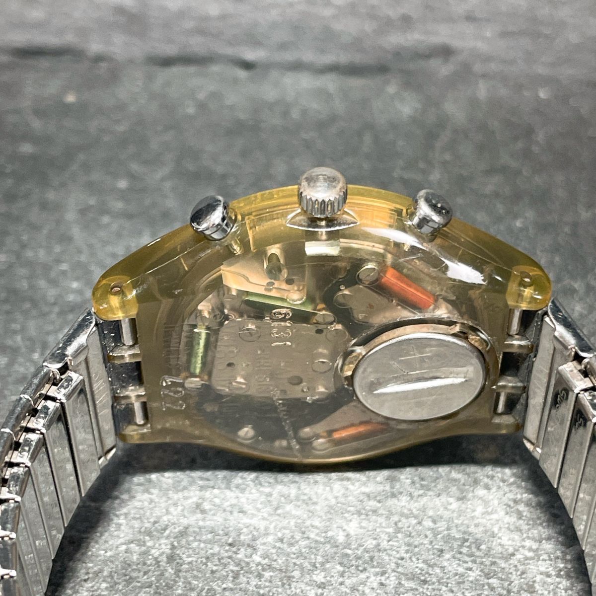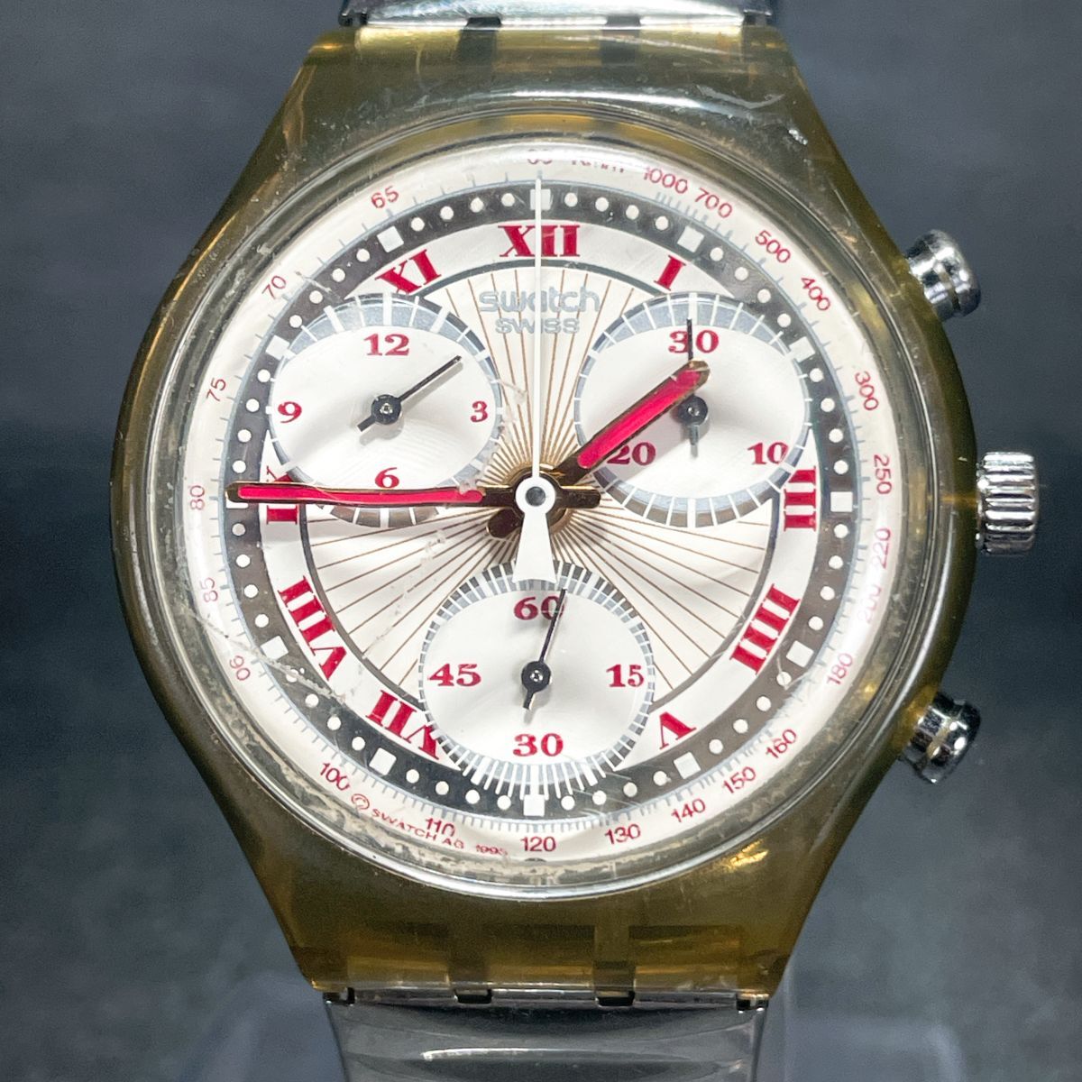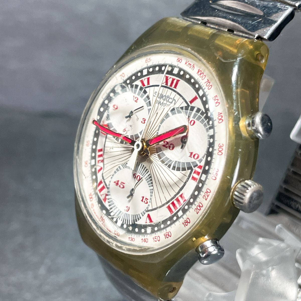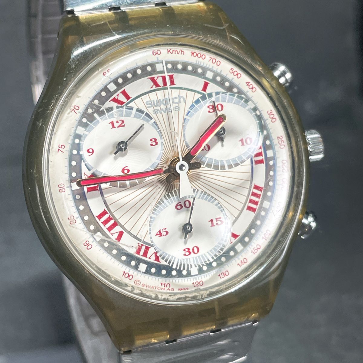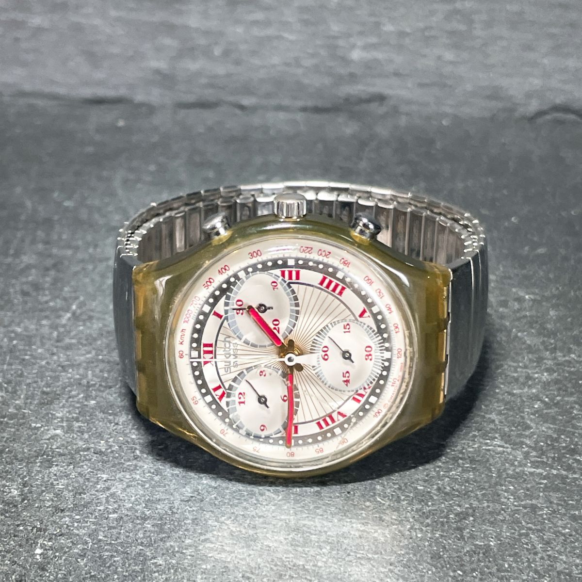 Swatch スウォッチ CHRONO クロノ PLEASURE DOME SCM106 腕時計 アナログ クオーツ スケルトン 伸縮バンド シルバー 新品電池交換済み