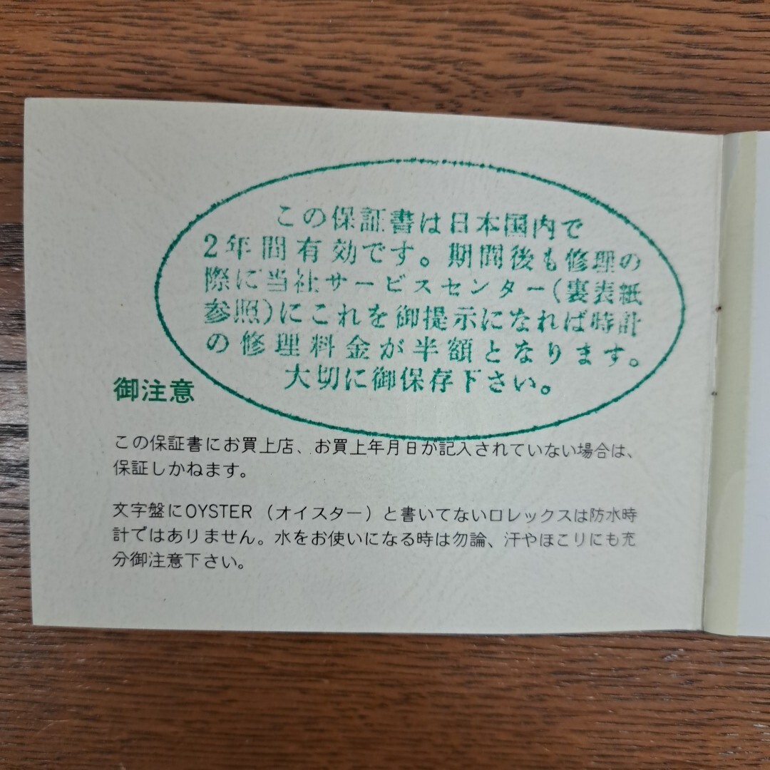 (1)表紙裏面 ・・・ この保証書は日本国内で2年間有効です。 ~ご提示になれば時計修理料金が半額になります