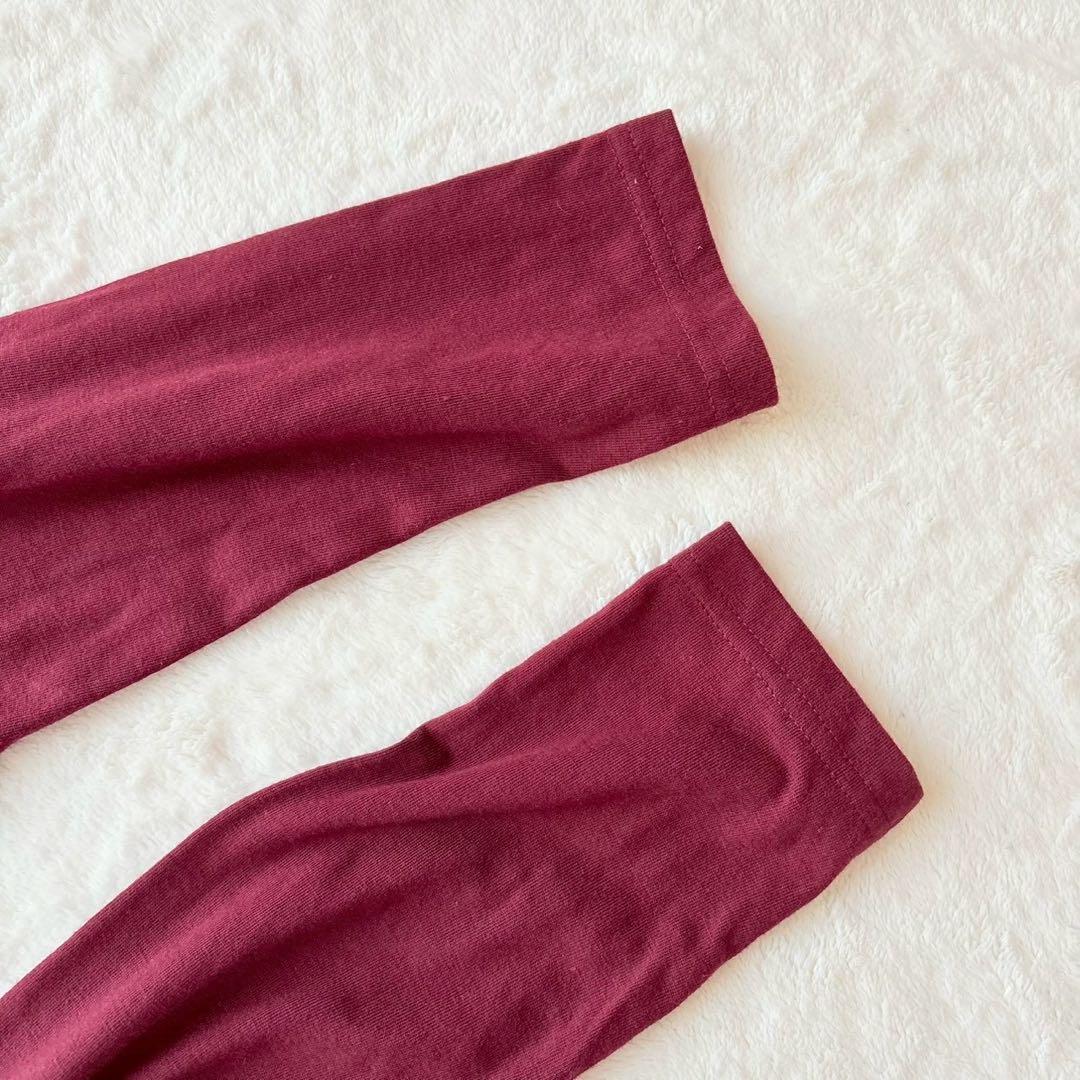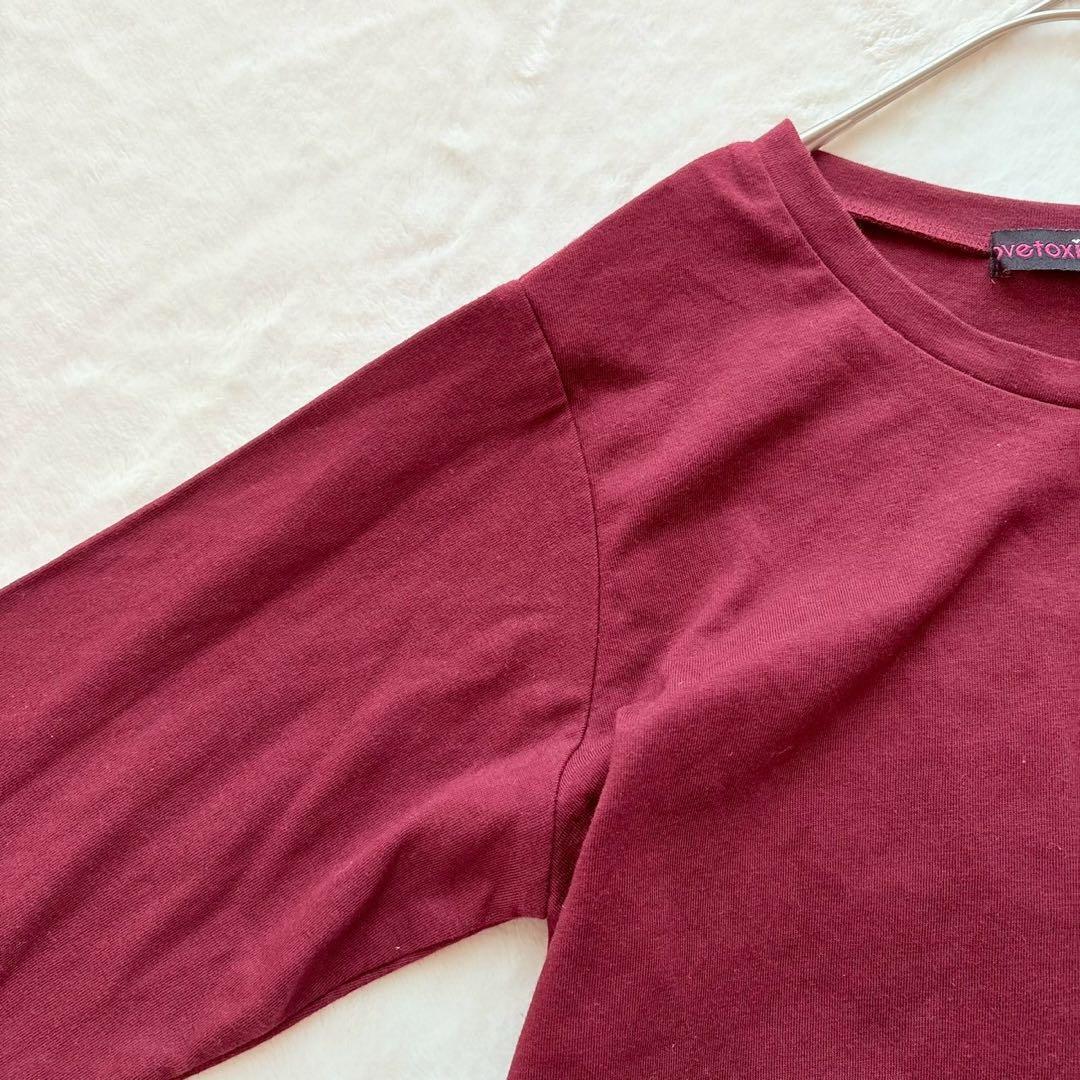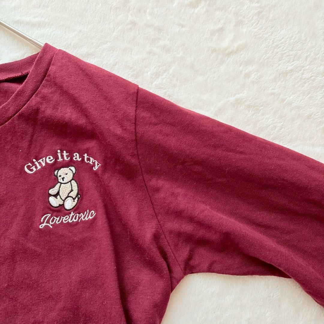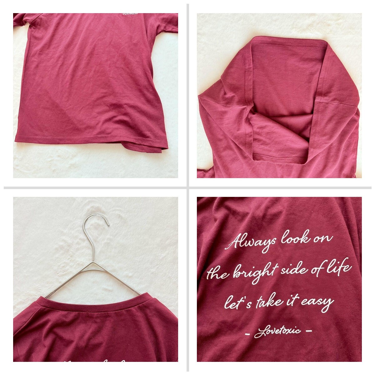 バーガンディ色の長袖カットソー、前面にキャラクターとメッセージ、背面にはポジティブなテキストがプリントされています。