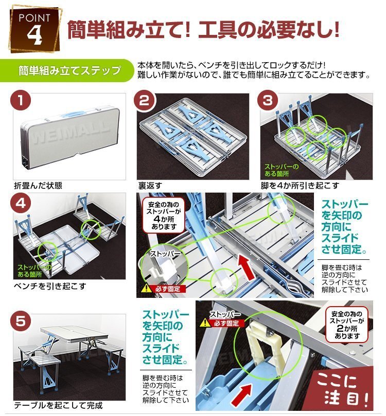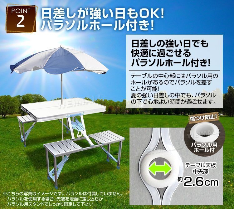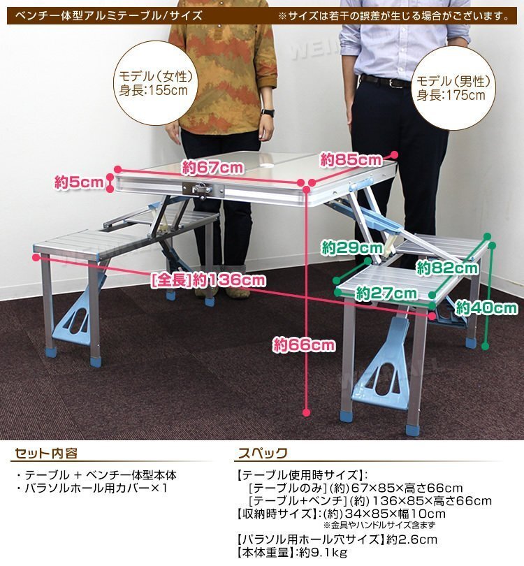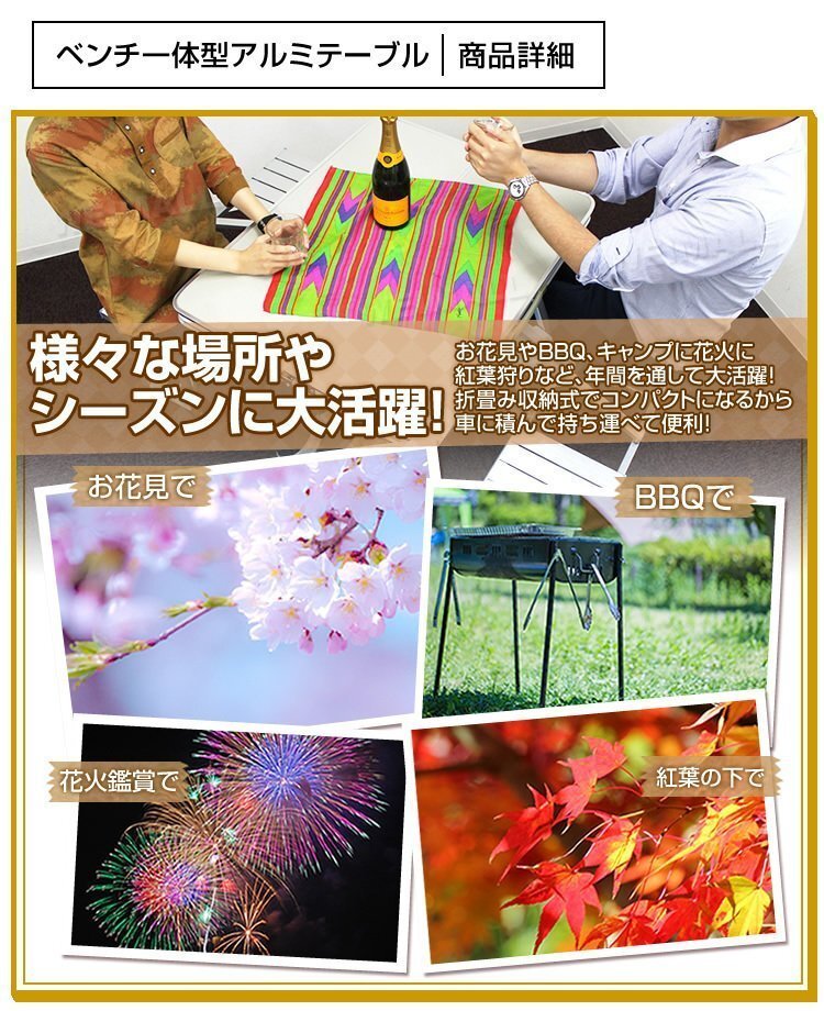 | テーブルとチェアが一つになった折り畳み式ピクニックテーブルです。 コンパクトに収納できて持ちやすい取っ手付きですので、持ち運びもラクラクです♪ サビに強いアルミを使用! 天板には防水加工が施されています。 組み立てはとっても簡単! 組み立ての際にもしまう際にも工具の使用は一切なし。 椅子を引き出すだけなので男女問わずに簡単設置。 天板中心部にはパラソル用ホールがあるので、ベランダやテラスでの使用にもおススメです♪ ピクニックやキャンプ、バーベキュー、運動会にもってこいの商品です。 【商品仕様】 ・折りたたみ式 ・テーブルサイズ(約):幅85×奥行67×高さ66cm ・収納サイズ(約):幅85×奥行10×高さ34cm ・椅子サイズ(約):幅82×奥行27×高さ40cm ・パラソル用ホール直径サイズ(約):26mm ・耐荷重(約):テーブル/25kg、椅子/50kg ・重量(約):9.0kg ・材質:アルミニウム、スチール、ポリプロピレン他 【注意事項】 ・海外製品で、簡易梱包での輸入のため風防に擦れや多少の小キズなどがある場合がございますが、商品自体には問題ありませんのでご了承下さい。 ・商品は、モニターによって色合いが異なって見える場合があります。 ・仕様・デザインは改良のため予告なく変更することがあります。 | 必ずお読みください。 ◇入荷状況により細かな仕様変更がございます。その場合、写真ではなく現物が重視されますので神経質な方は入札をご遠慮ください。 ◇当商品は海外製品になりますので、細かいキズ、ネジのゆるみなどがある場合がありますが、返品・交換対象とはなりません。神経質な方のご入札はご遠慮ください。 ◇商品内容はあくまでも出品概要に基づきますのでご注意ください。 ◇本商品を使用した際に発生したトラブル、事故につきまして、当社は一切の責任を負いかねます。 ◇メーカーではないため、専門的なご質問にはお答えできません。 ◇検品確認済みですので破損以外の交換には応じられません。商品到着時にはその場で開封、破損の有無を確認し、破損の場合には受け取らないか配送業者に申し出てください。 ◇加工および一度装着した商品の返品・交換には対応できません。事前の確認をお願いします。 また、商品の取付にかかわる費用等の弁済には対応できません。 ◇付属のコードなどの切断による、繋ぎ変えなどをされた商品に対しての、返品・交換は致しません。 ◇取り付けによる破損接続不良等責任を負いかねますので専門業者に依頼するかご自身の責任でお取り付けください。 |