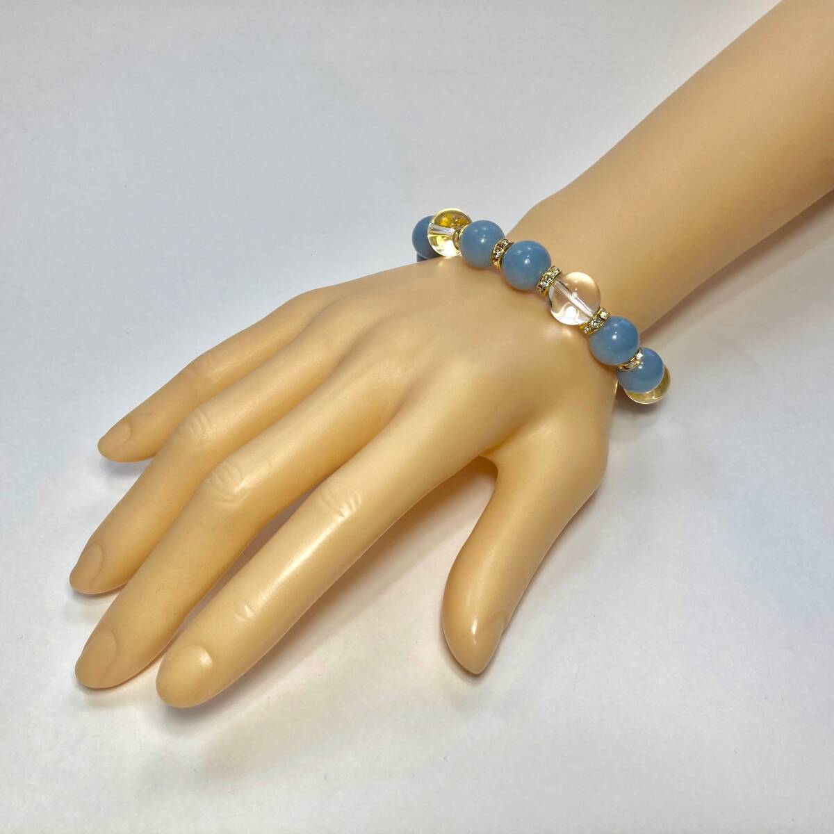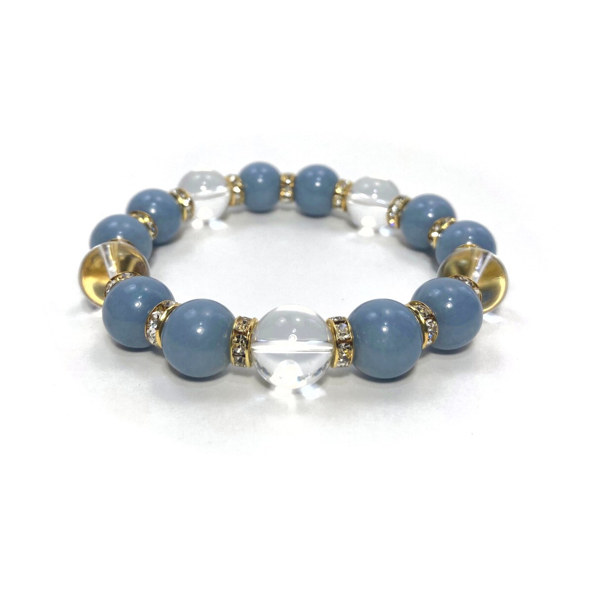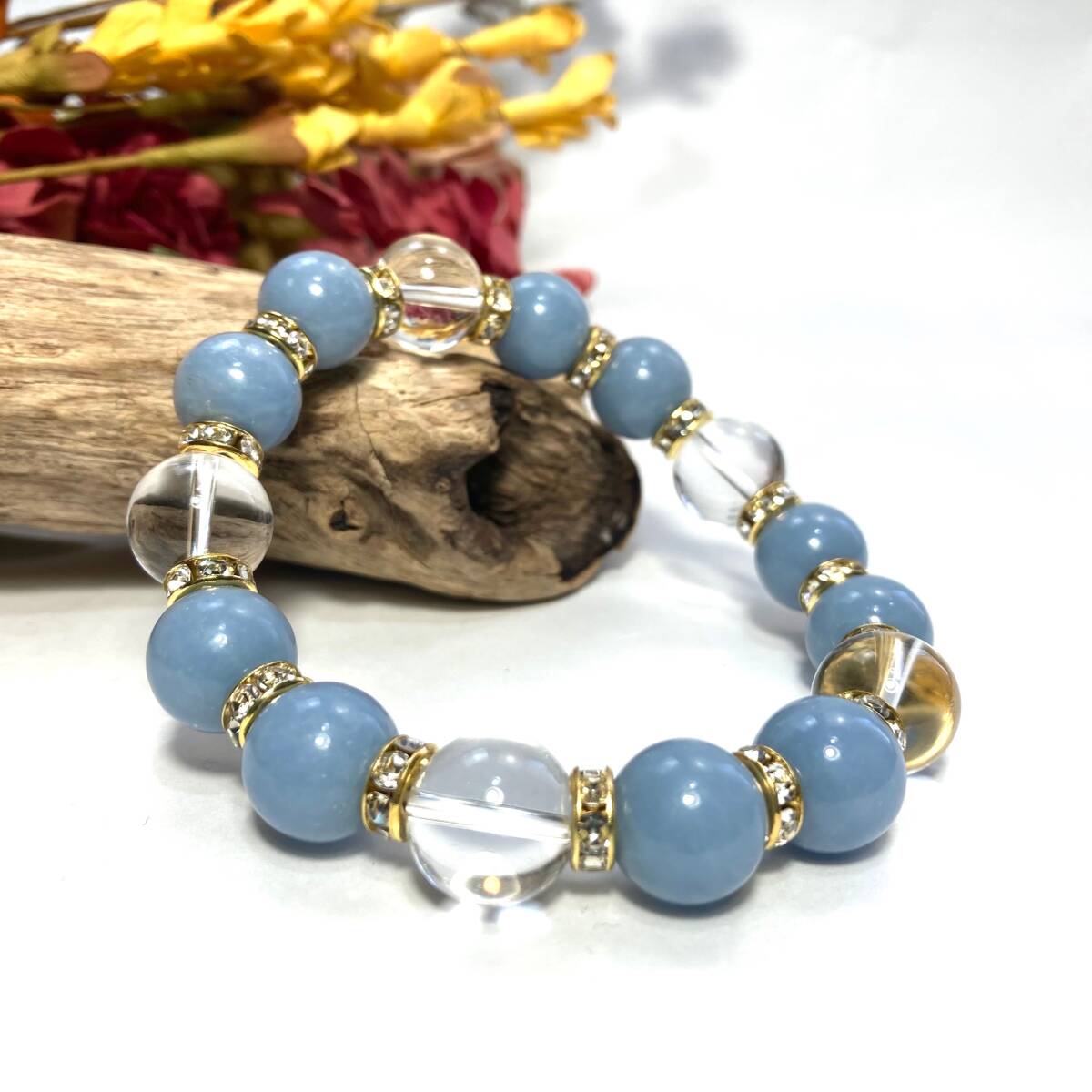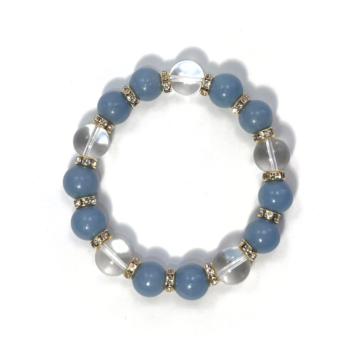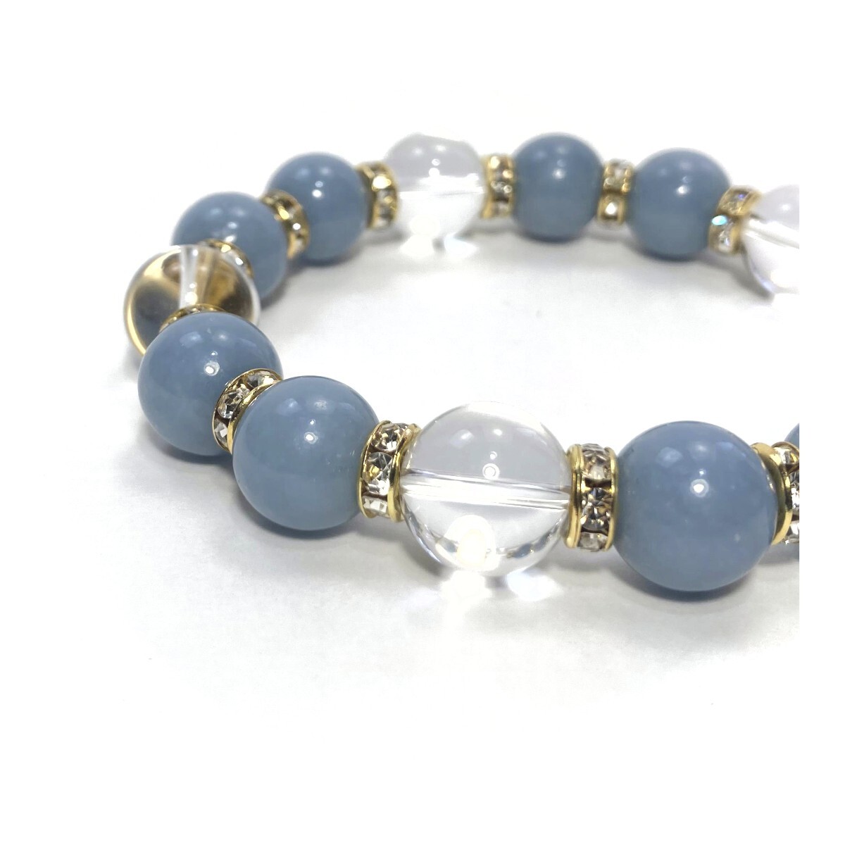 こちらは、エンジェライトと水晶を組み合わせたパワーストーンブレスレットです。間にはロンデルを挟み高級感あるデザインに仕上げております。石大きさは12mm玉を使用して内径約18cmです。気になる方は是非この機会にどうぞ。