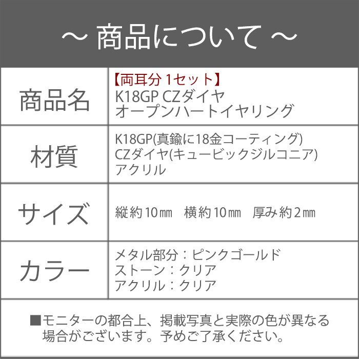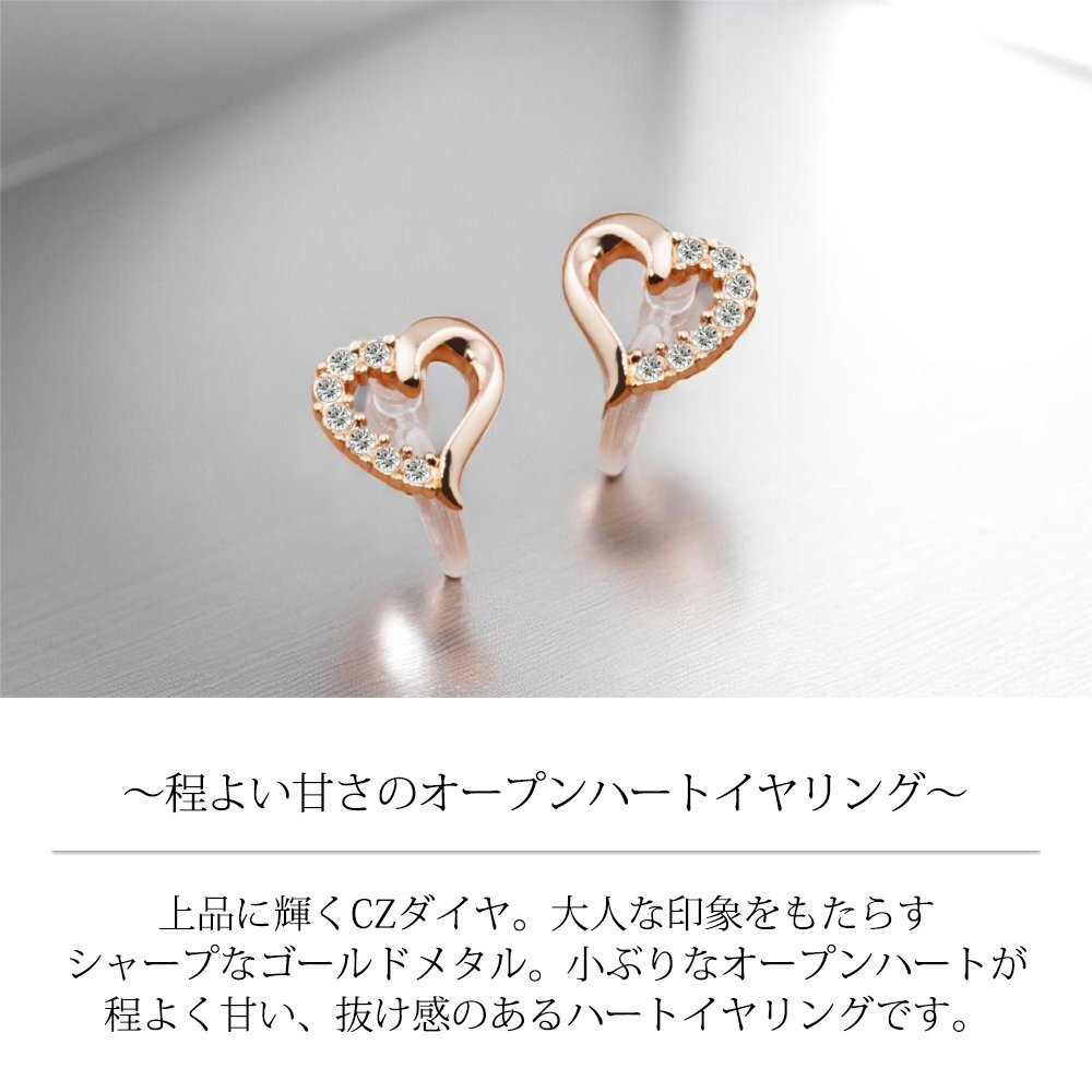 新品/イヤリング/K18GP/レディース/オープンハート/18金/18kコーティング/ピンクゴールド/小ぶり/痛くない/樹脂/金属アレルギー/ダイヤ/CZ