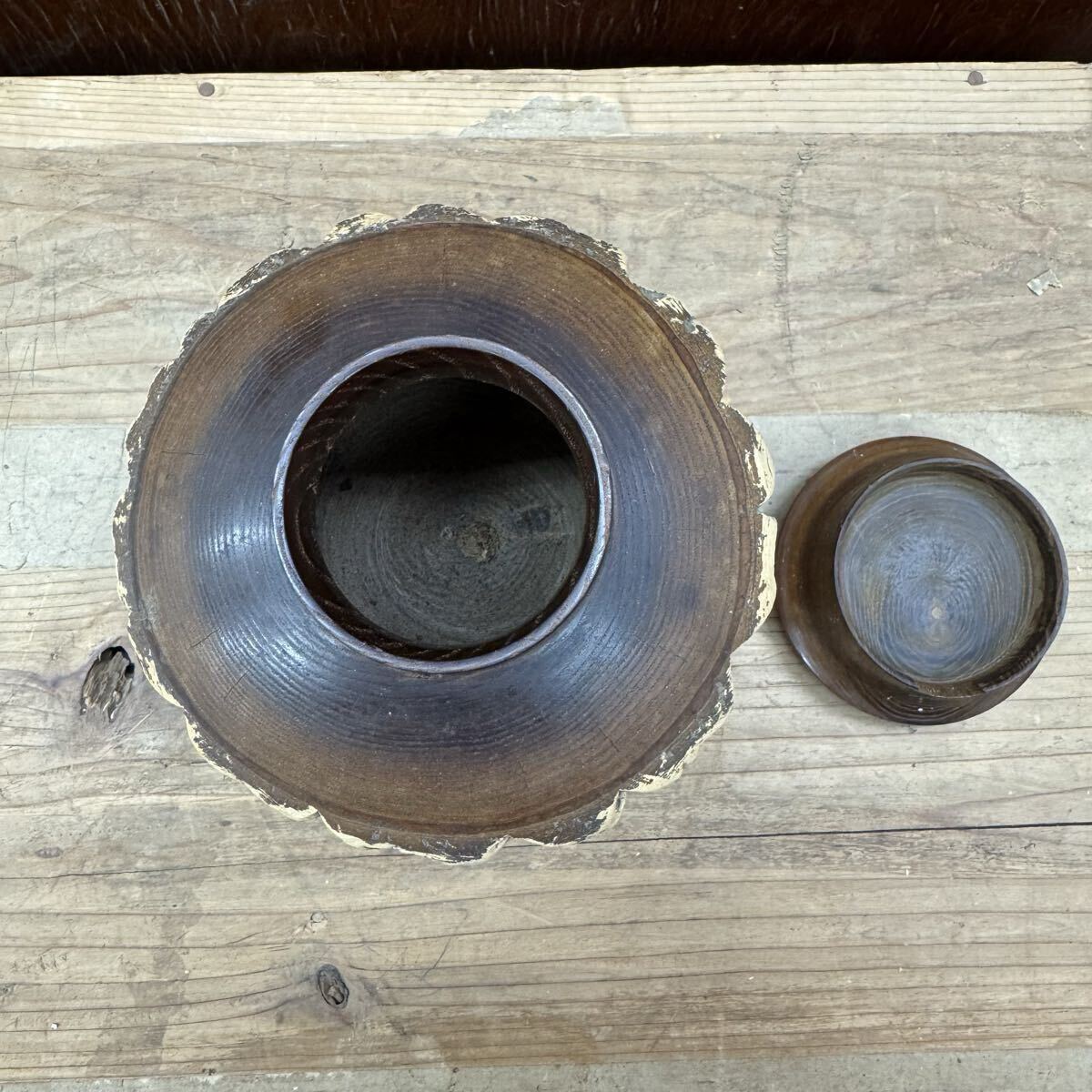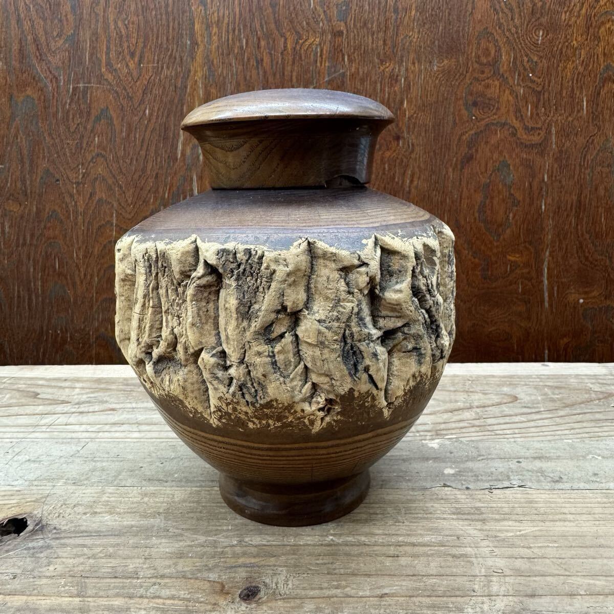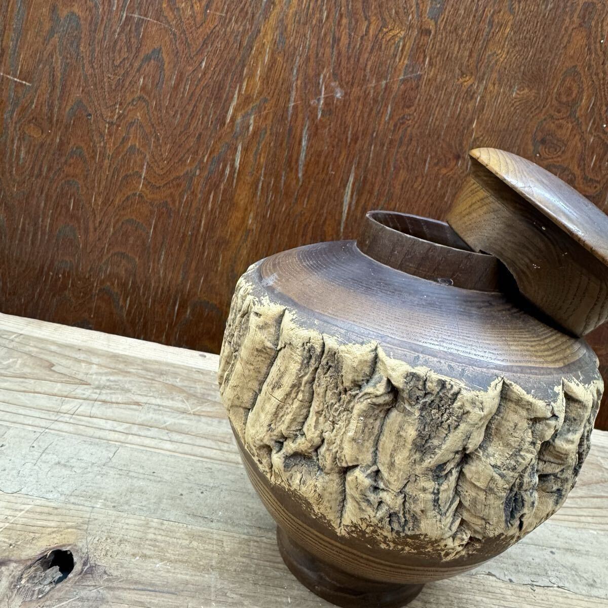 祖母の家の整理中に出てきた、木工職人によるハンドメイドの木製壺です。