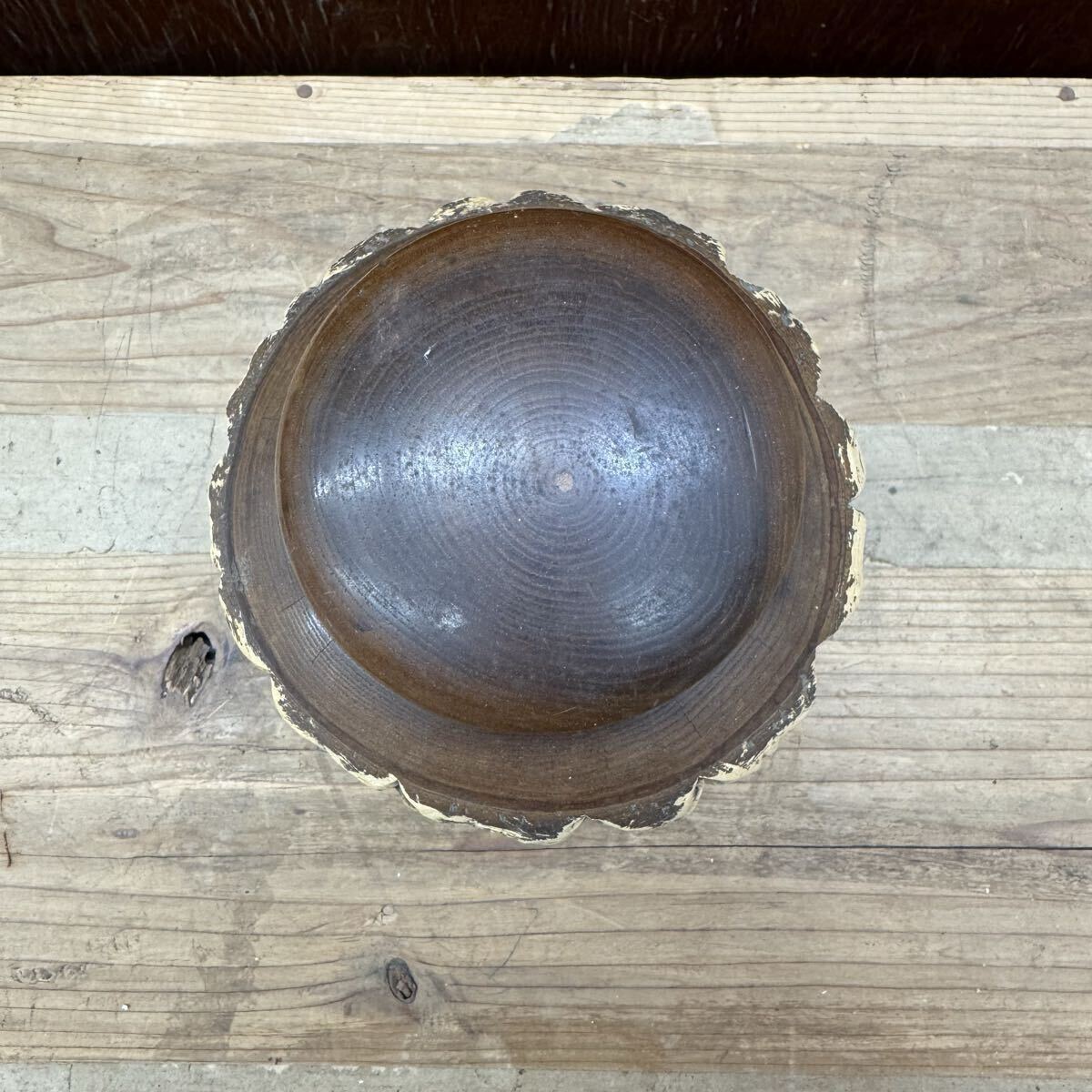 ろくろ挽き(旋盤加工)で滑らかに成形されており、胴の周囲には木の外側の荒肌(ナチュラルエッジ)が残されているため、自然の表情を生かした力強いデザインになっています。
