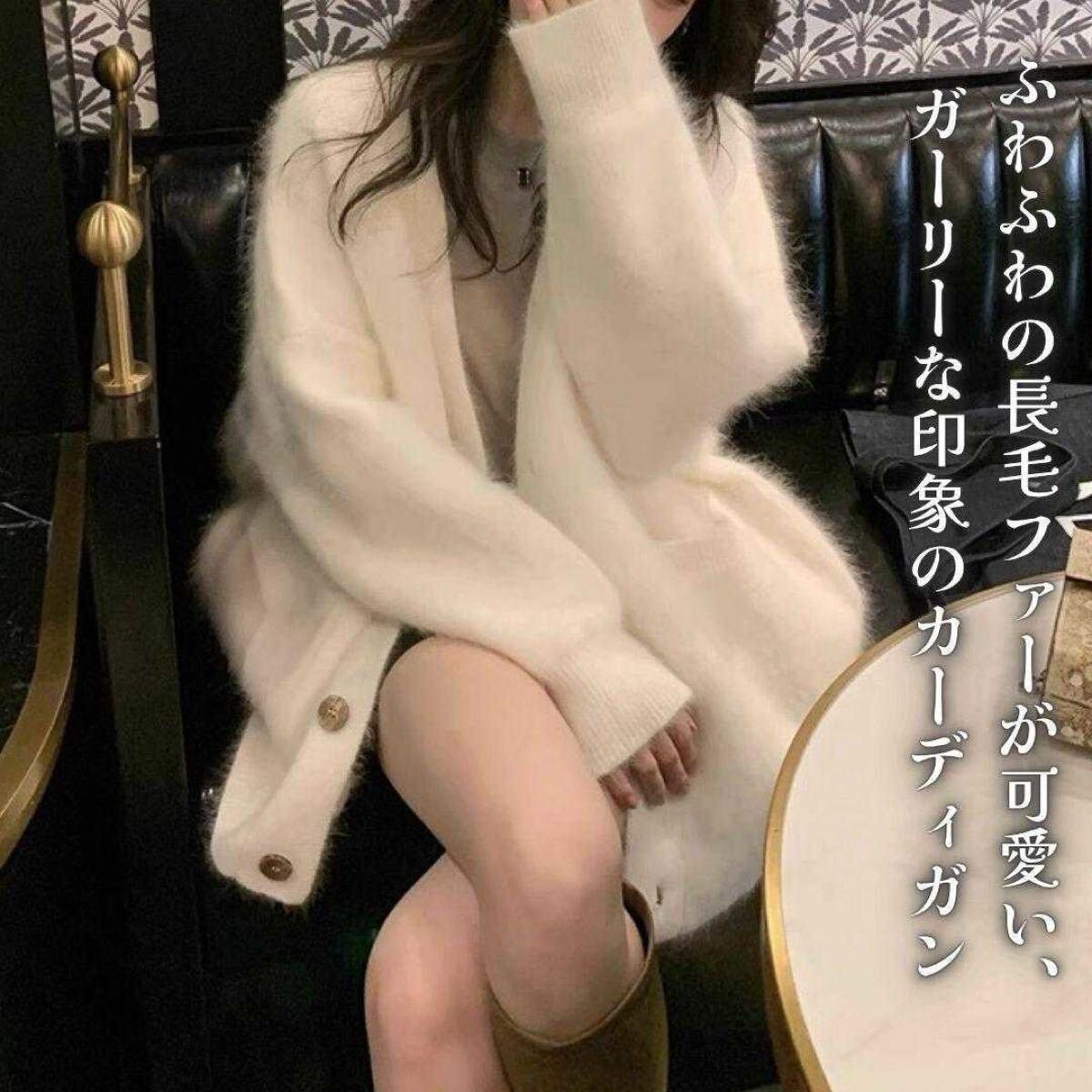 ふわふわ長毛ファーが可愛い、Vネックのモヘア風シャギーニットカーディガンです。