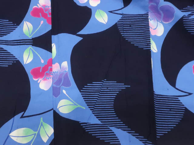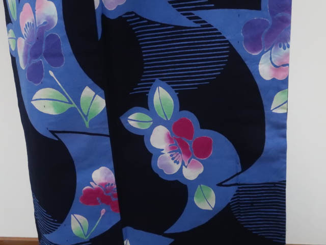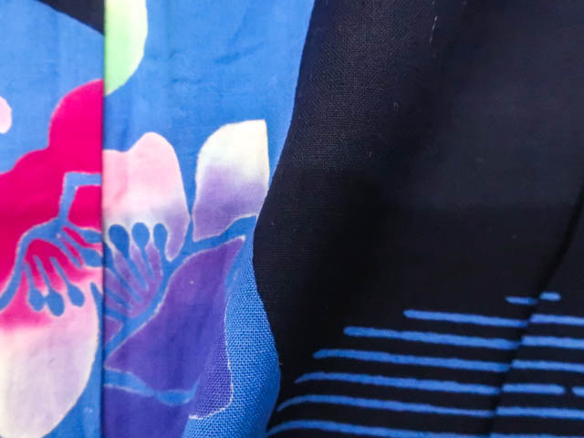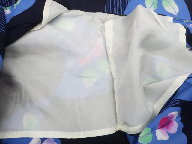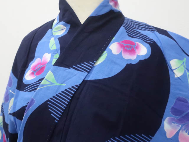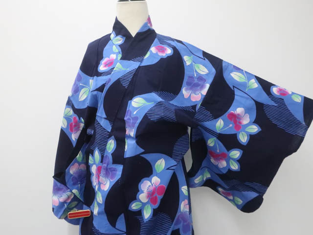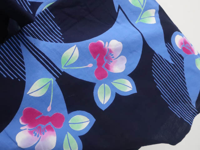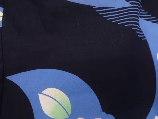 肩当付きです。リサイクル商品のため、下前衽・右後身頃に薄汚れがございますがご着用いただけると存じます。 地色は紺です。 1枚目の画像が近いお色かと思われます。 素材は綿です。 |