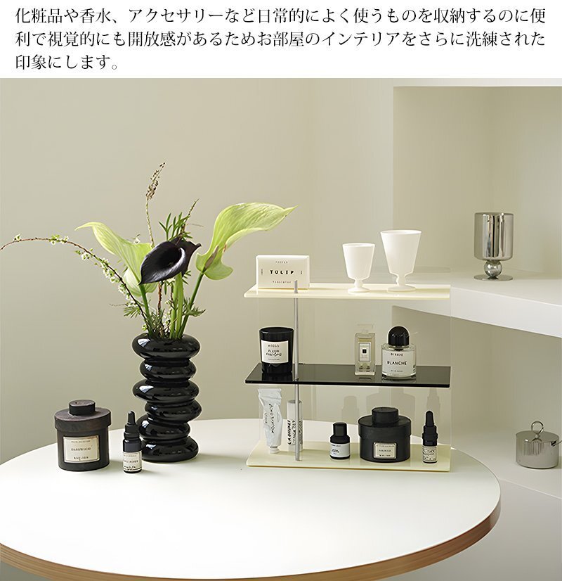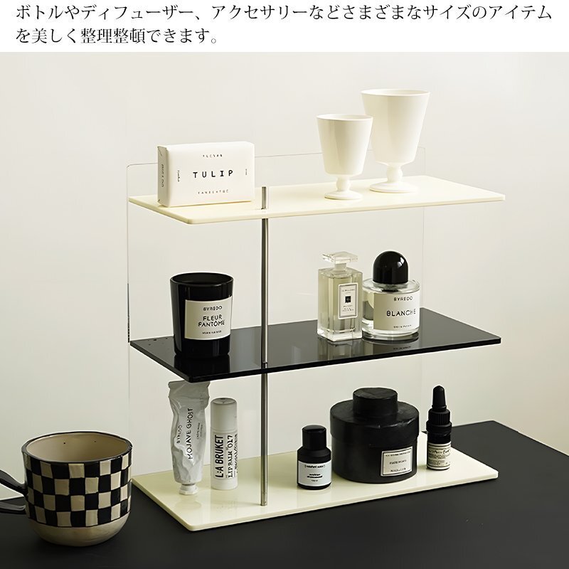 ![]() 3段アクリルラックはシンプルかつスタイリッシュなデザインで、お部屋のインテリアをすっきりとまとめてくれます。 透明感のあるアクリル素材は軽やかな印象を与えながら香水や化粧品、小物などをディスプレイするのに最適です。 ボトルやディフューザー、アクセサリーなどさまざまなサイズのアイテムを美しく整理整頓できます。 モダンなクロームメッキのフレームがアクセントとなり機能性とデザイン性を兼ね備えたラックです。 仕切りのないフリースペースでどの方向からでもアイテムを取り出すことができるデザインが特徴です。 自由な配置が可能なため、使い勝手が良く手軽に必要なアイテムを取り出せます。 化粧品や香水、アクセサリーなど、日常的によく使うものを収納するのに便利で視覚的にも開放感があるため、お部屋のインテリアをさらに洗練された印象にします。 ※本体にキズや汚れを防止する薄いフィルムが付いておりますので剥がしてお使いください。 カラー:ベージュ×ブラック×クリア サイズ(約):幅31cm×高さ29cm×奥行き14cm 重量(約):1.2kg 材質: 棚部分:アクリル 留め具:鉄 |