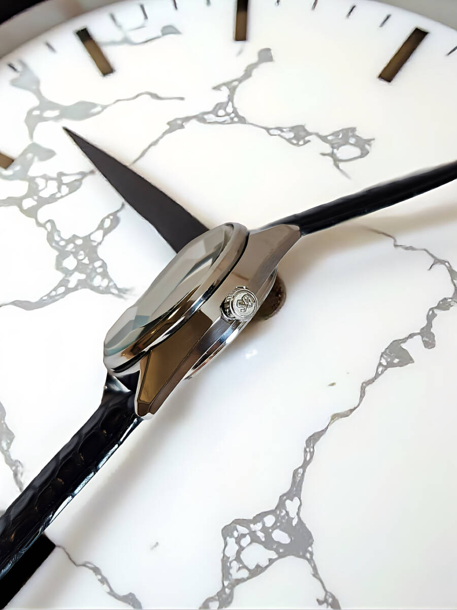 昼光や照明下で見るたびに表情が変わる美しい文字盤は、61GSビンテージならではの高級感と上品さを際立たせています。