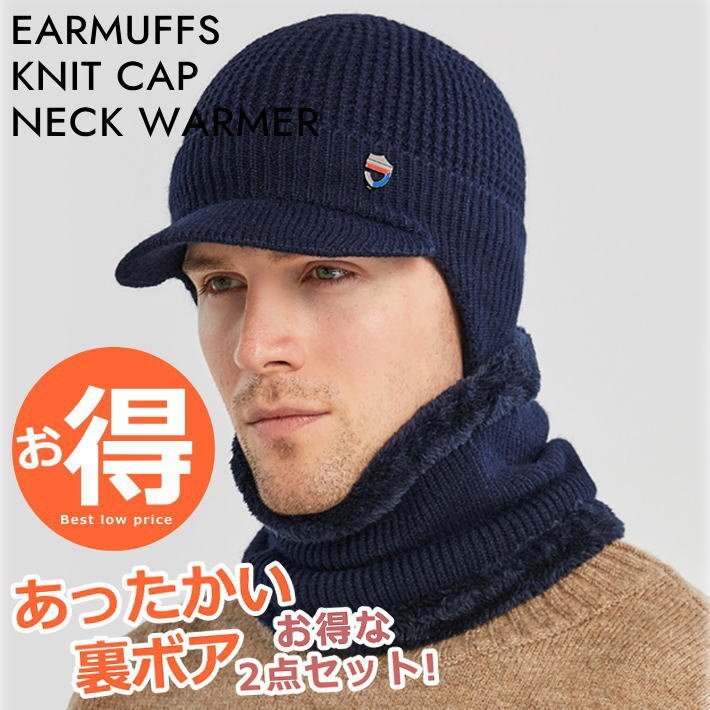 裏ボア ニット帽 ニットキャップ マフラー ネックウォーマ 耳あて メンズ レディース つば付き 帽子 7987619 ネイビー 新品 1円 スタート