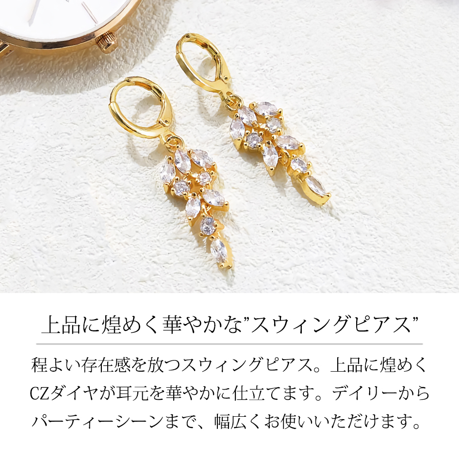新品/ピアス/K18GP/リーフ/葉/揺れる/ロング/ダイヤ/18金/ゴールド/レディース/両耳/開閉式/フープ/シンプル/長い/上品/CZ/女性