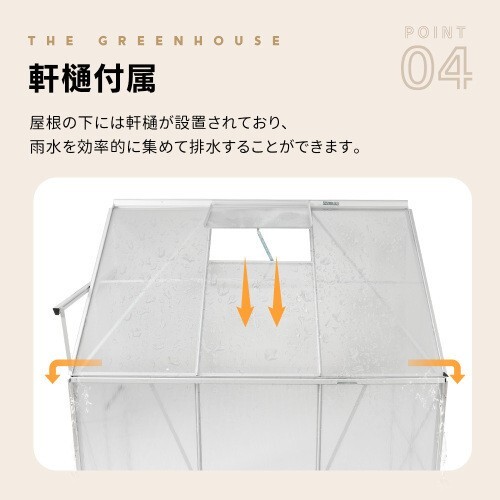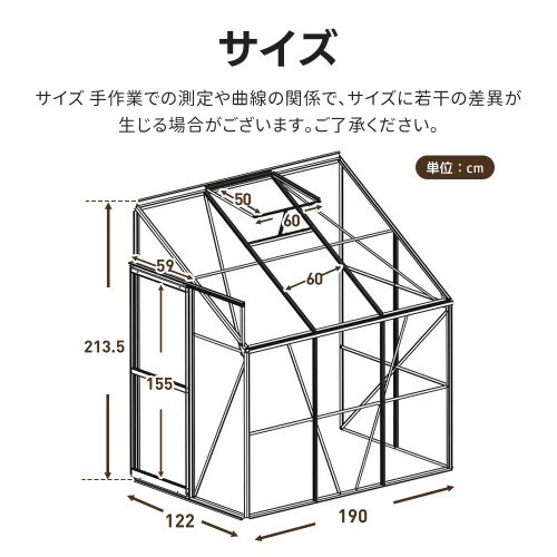◆01 1.設置工事につきましては、専門業者へのご依頼が必要です。本商品には設置工事は含まれておりません。また、弊社では設置業者の手配サービスは行っておりませんので、お客様ご自身で業者にご連絡いただきますようお願いいたします。2.返品交について:商品到着後、部品の破損、打痕等のご確認をお早めにお願い致します。もし部品の破損、打痕がある場合、当店のアフターサービスをご連絡ください。3.部品の点検は、業者にご連絡いただく前に行うことをお勧めします。4.温室は壁に寄せて設置する必要があります。◆02壁掛け式のハーフデザイン小さな庭でもしっかりな温室設置可能植物を守る家庭用温室は、寒さや霜、雪、強風などの厳しい気候から植物を守り、特に寒さに弱い植物には効果的です。また、冬でも暖かい環境を提供することで生育期を延ばし、適切な湿度を保ちながら、植物が健康的に育つための理想的な条件を整えます。夏は涼しく、冬は暖かい光合成UV防護温室は日中に太陽光を取り込み、光合成を促進することで植物の成長を助けるとともに、紫外線を軽減して植物を保護します。保温防水ポリカーボネートパネルが日中に蓄えた熱を保持し、内部の温度を安定させます。これにより、外気温の低下による冷え込みや霜の発生を防ぎ、大切な植物を安全に守ります。◆03材質のこだわりアルミフレームとポリカーボネートパネルを採用し、耐久性と透明度を兼ね備えています、その同時に日光を十分に採り入れます。アルミチューブには酸化処理を施し、錆びにくく長持ちする設計となっています。また、5cm幅の追加サポートバーを備えており、全体の構造をさらに強化し、安定性を高めています。◆04通気性がいい構造大きなドアと上部の窓で通気性を確保し、空気がスムーズに流通させます。植物に快適な環境を提供します。窓開閉式の窓は5段階に調節可能で、さまざまな通風ニーズに対応します。ストッパーが付いているの簡単に調整できます。ドアスライド式のドアを採用しており、出入りがよりスムーズに行えます。◆05軒樋付属屋根の下には軒樋が設置されており、雨水を効率的に集めて排水することができます。温室の劣化を防ぎ、長期的な耐久性を確保します。◆06基礎の準備温室を安全に設置するために、しっかりとした基礎が必要です。適切な基礎を作ることで、強風や地震などの外的な力から温室を守り、安定した使用を保証します。1.基礎の寸法温室の基礎は、最低でも幅30cm、深さ30cmを確保してください。推奨される寸法は、幅30cm×高さ50cmです。特に、地面下に埋め込む部分は10~30cmとし、基礎の地上部分の高さは全体の50%以内に抑えることが重要です。2.コンクリート基礎の推奨長期間安定して使用するためには、コンクリート基礎を推奨します。地面が不安定な場合でも、コンクリート基礎を用いることで温室をしっかりと固定し、強風時の倒壊や地面の沈下を防ぎます。コンクリートの厚さは10cm以上とし、完全に水平で平らな基礎を作ってください。温室のフレームはアンカーボルトで基礎に固定し、風などの外力に対する耐久性を高めます。3.アンカーの設置基礎が整ったら、温室をしっかり固定するためにアンカーボルトや地面杭を使用してください。これにより、風や地震時の温室の移動や転倒を防ぐことができます。4.基礎を作らない場合のリスク適切◆07土台の組み立て土台設置の注意点土台を設置した後、土台の向きをご注意ください。スチールペグで土台をしっかりと固定する方法については【図3】をご参照ください。地面が土の場合:土台の設置向きは【図1】の通りに設置してください。地面がコンクリートの場合:土台の設置向きは【図2】の通りに設置してくださいご注意:※お客様組み立て品となります。※本商品の組み立てやご使用に際しては、乱暴に扱いますと損害やケガの原因となりますので、丁寧にお取り扱いください。※商品デザインは、品質に差し支えない程度に、予告なく変更する場合があります。※新しく入荷した商品は今まで販売していた商品と色差がある場合がございます。※商品のデザインが写真と違う場合がございますが品質上の問題なく使えますのでご了承下さい。※必ず水平で、安定した場所に設置してください。※運送途中に損害をもたらす可能があり、ご心配なく気軽に弊社とご連絡ください。※大型商品ですので、開梱後のお客様都合による、ご返品を承る事が出来かねます。