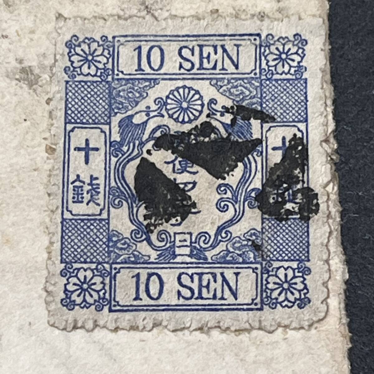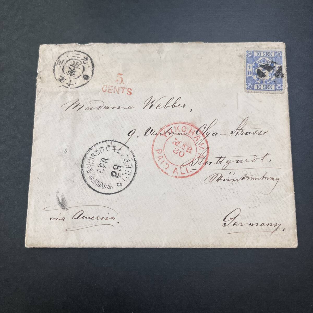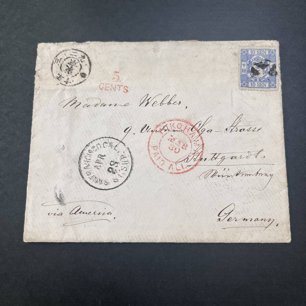 【1877年 手彫桜切手貼外信書状】改色桜10銭単貼 米国経由ドイツ宛書状 白抜十字印抹消 YOKOHAMA PAID ALL印 評価120,000円 エンタイア