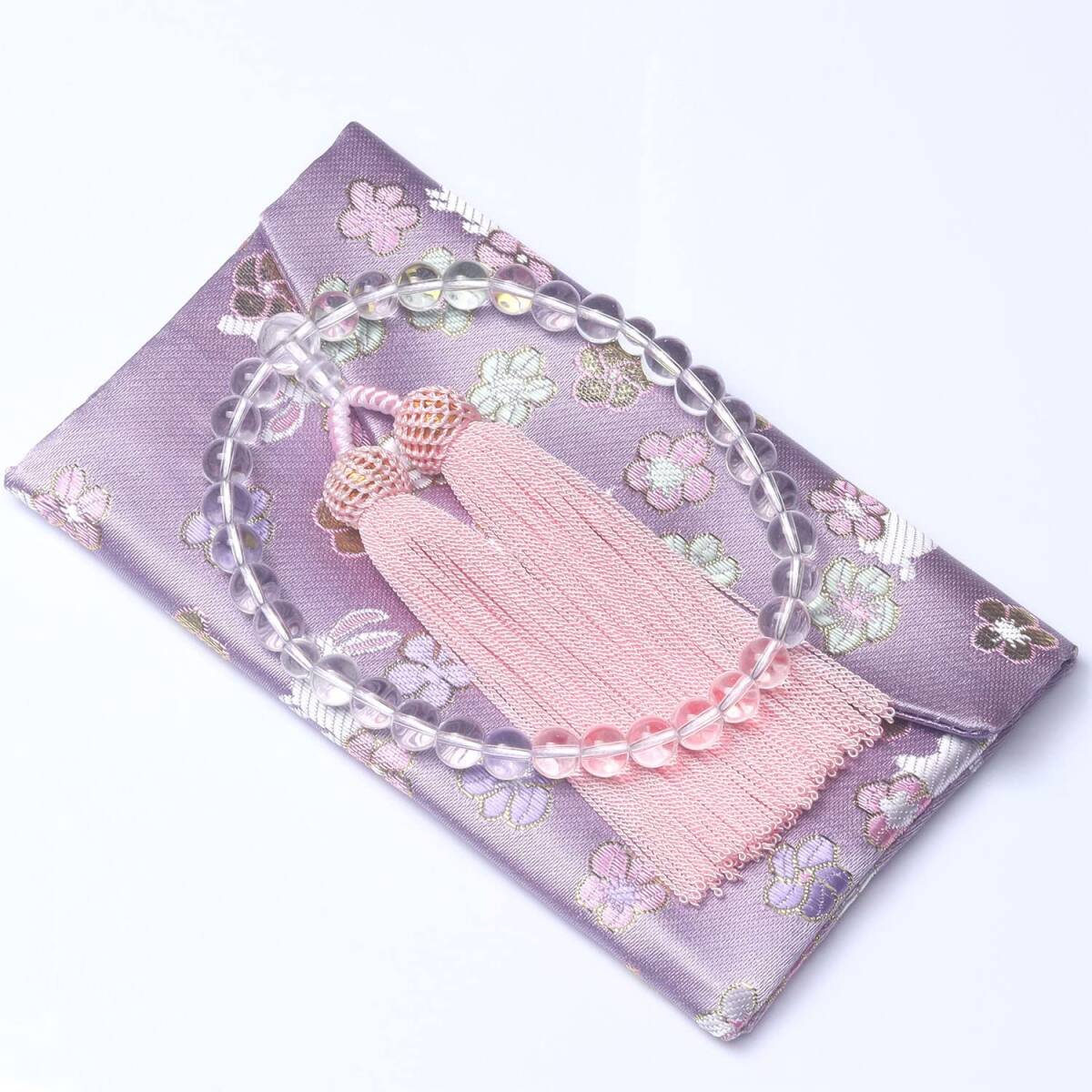 色は落ち着いたピンクです。渋い数珠を嫌がる10代20代などの若い方に特におススメしますが、愛らしくエレガントな数珠をお望みの年配の方にももちろん最適です。
