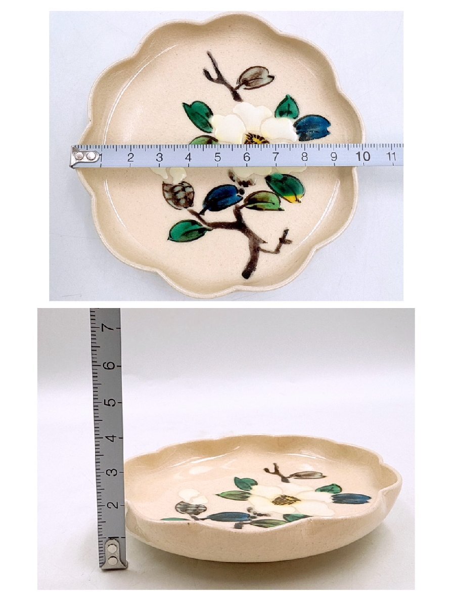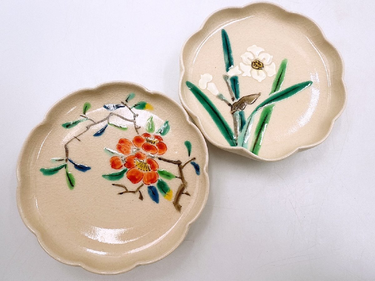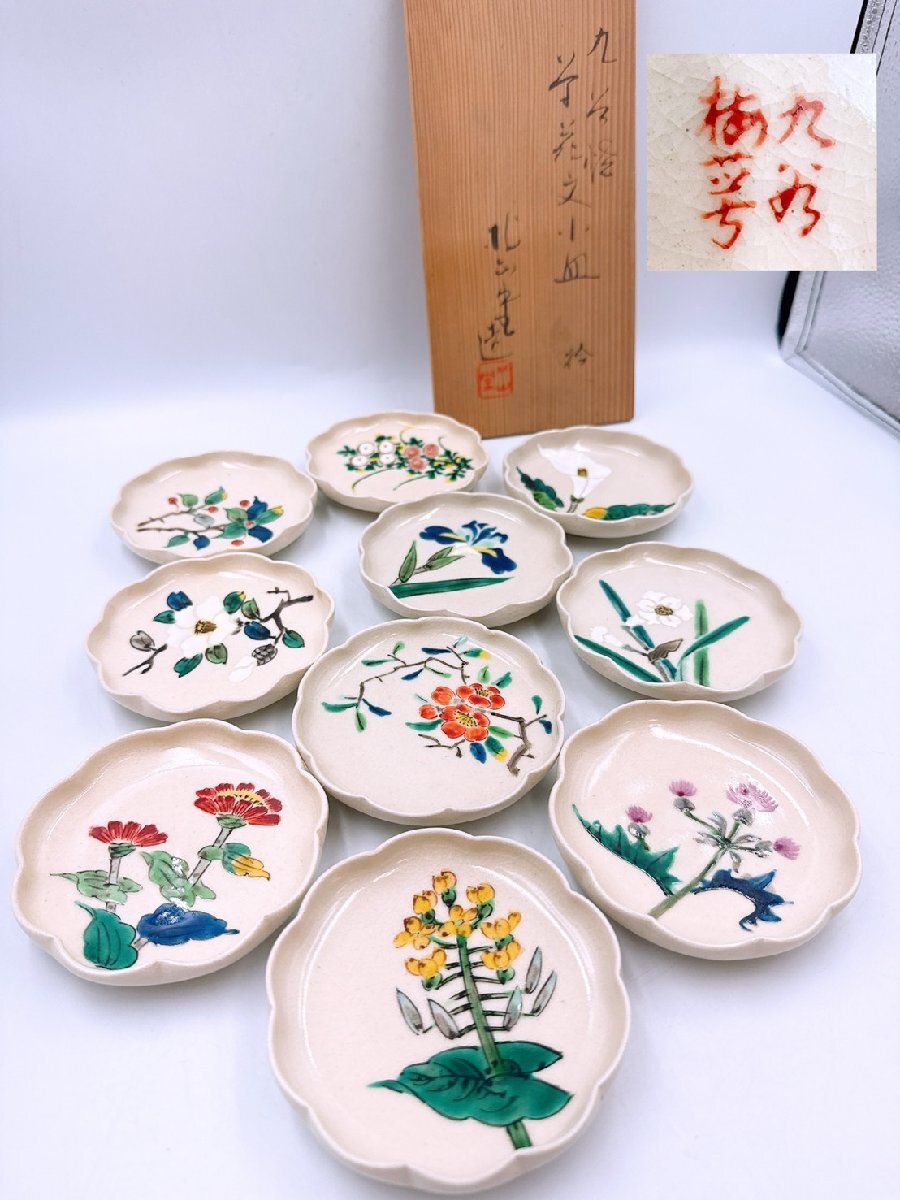 1円 九谷焼 北山堂造 色絵 絵変わり 花図 小皿 10客 口径10㎝ 共箱付 現状保管品【KD001】
