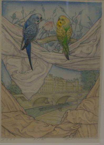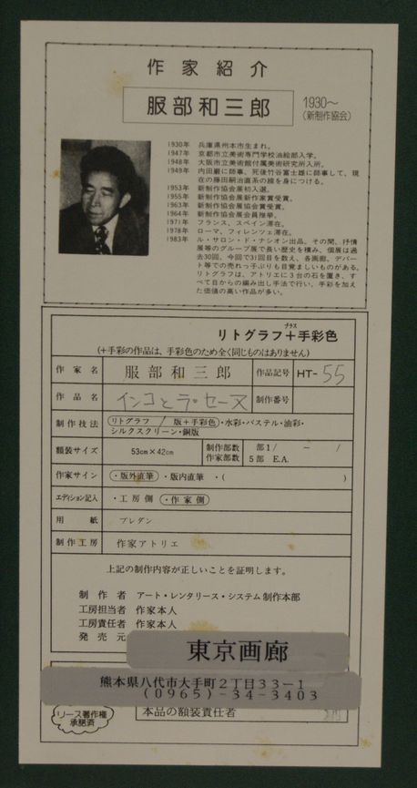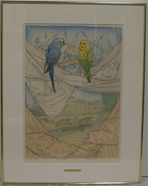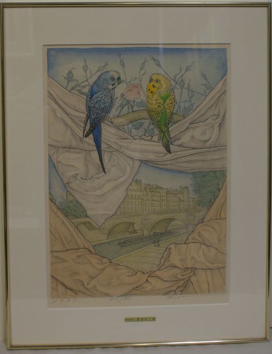 ・作者名: 服部 和三郎・画題:インコとラセーヌ・技法:リトグラフ(81/85)(Aー42)H1-R4-6-24-98.5)