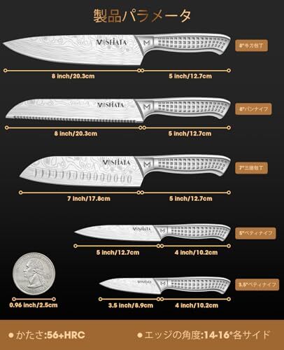 【価値刃物セット】このキッチンカッターは56+ロックウェル硬度のjapenステンレス鋼で作られている。防錆性と耐久性があります.7つの刃物セットは含みます:203mm包丁です、178mm三徳刀です、203mmパン刀、127mm万能ナイフです、89mm果物ナイフです、ぞうきん、手を洗います。鋼全体成型、継ぎ目なく溶接、折れにくく、耐久性と信頼性を保証します