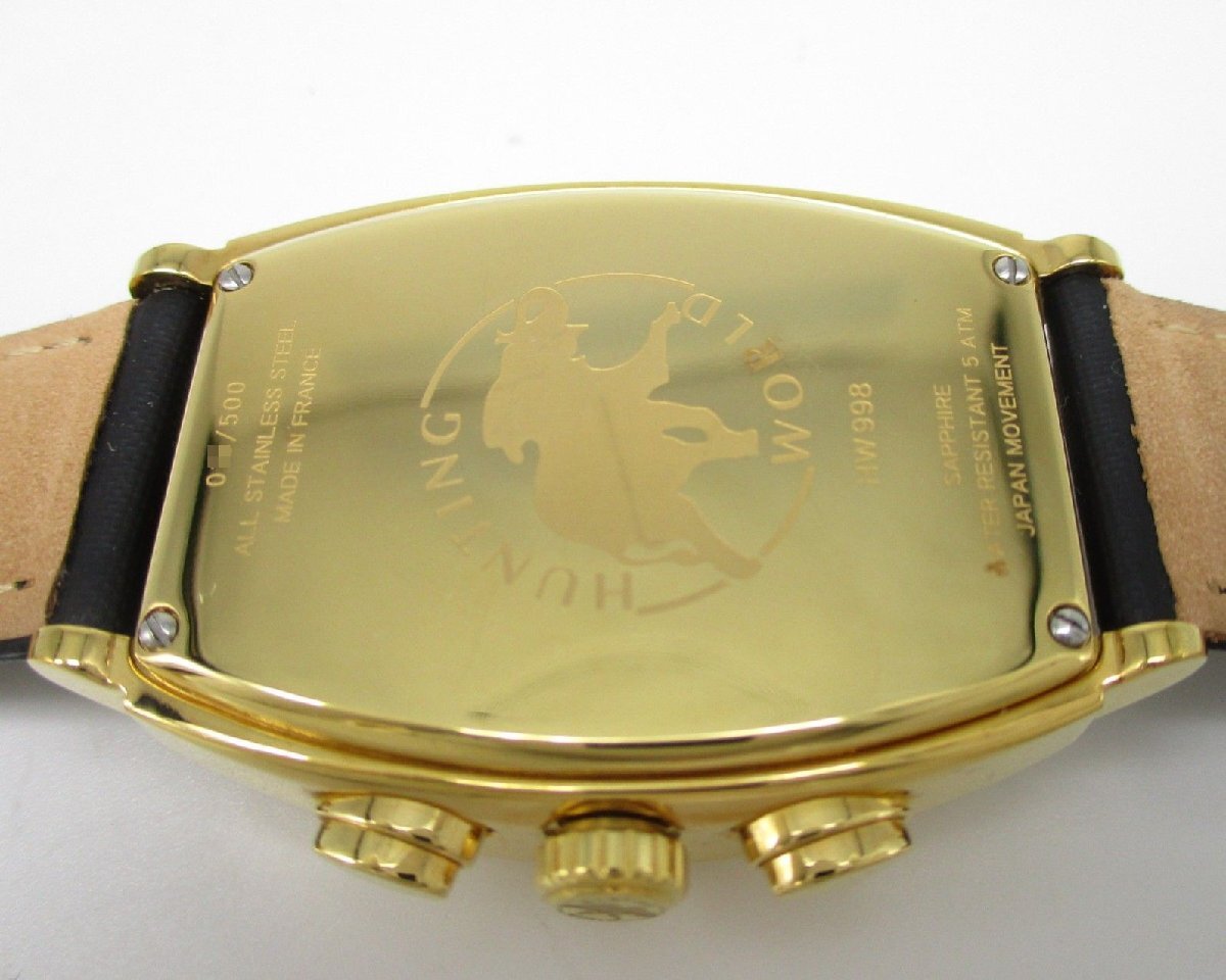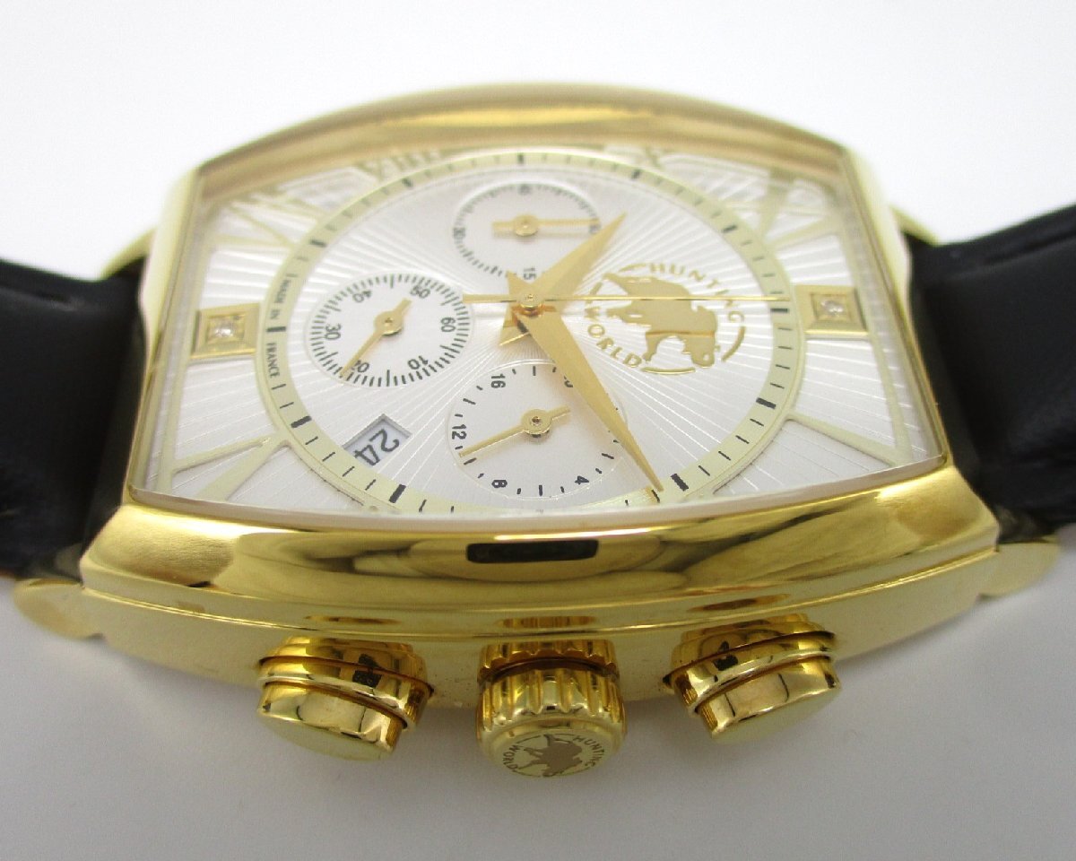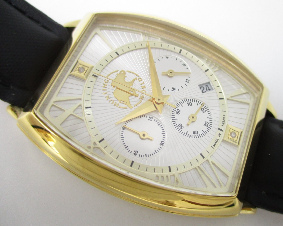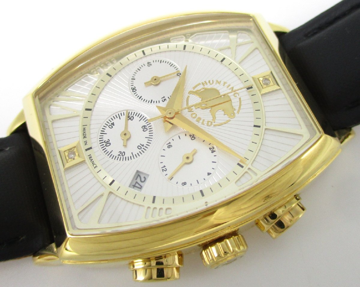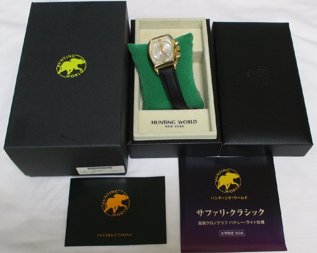HUNTING WORLD ハンティングワールド サファリ・クラシック フランス製 世界限定500点・メンズ・クォーツ・SS・サファイヤガラス・ダイヤモンド2石ダイヤル・5気圧防水仕様・バチューライトバンド 【型番】HW998 【およそのサイズ】ケース幅:33㎜ ケース縦:38.8㎜(除ラグ部) 【状態】本体:ガラスは無傷です。文字盤、針に汚れやサビは見られません文字盤に汚れはありません。他部には小傷が幾分見られます。画像7のシリアル番号は画像処理してあります。 ベルト部:純正です。使用感は強くはありません。 クォーツ時計の入っている電池はモニター電池扱いでお願いいたします。発送までに止まった場合は電池交換後、発送いたしますが、 その後の電池切れの際は、落札者様御自身でメーカーもしくは一般店に電池交換にお出しください。 【付属品】外箱・内箱(おそらくクッションは社外)・保証書兼取扱説明書(R5.6) |