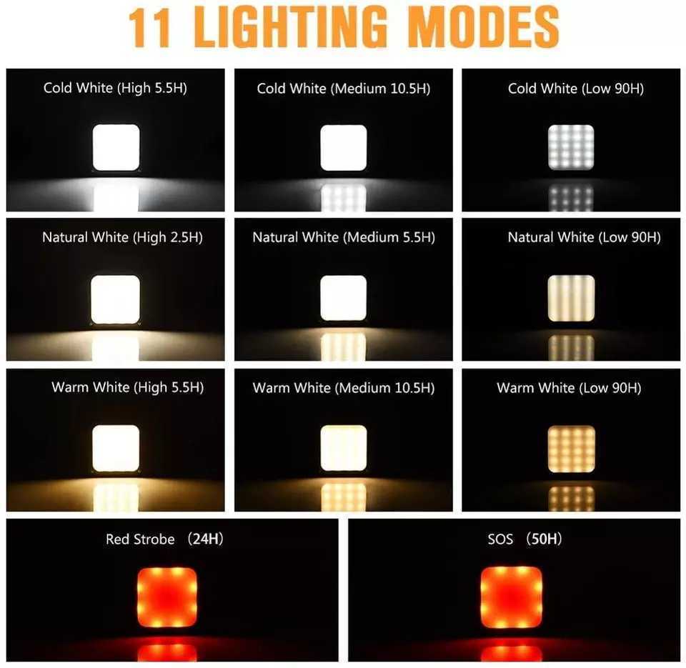 ・シーンに合わせてWarm/WarmWhite/Daylightの3つの色温度とそれぞれの色温度で3段階の光量+SOSモード(RED点滅)を選択できます。※SOSはモールス信号の発光パターンを採用。