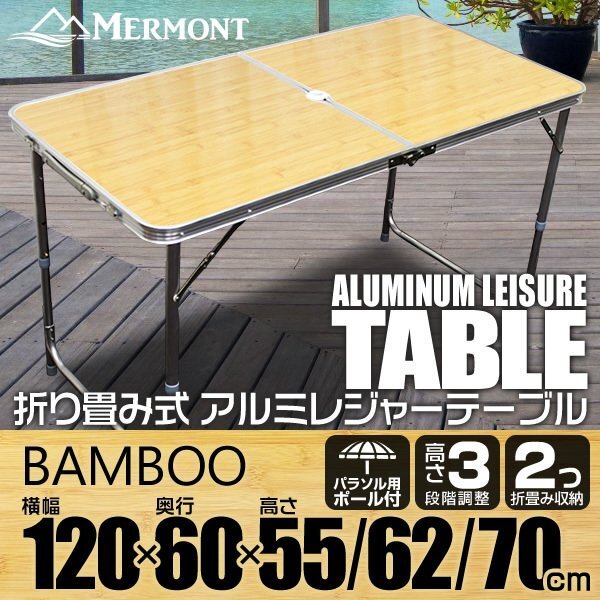 | MERMONT - メルモント - アルミレジャーテーブル 折りたたみ収納式 耐熱・耐水加工 パラソル用ホール付き |