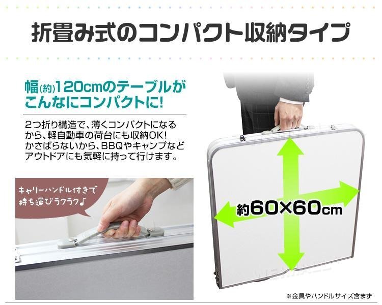 | アルミ製 折りたたみ式 アルミレジャーテーブル 横幅120×奥行60 2つ折り収納 高さ3段階調整 55/62/70cm カラー一覧 | |