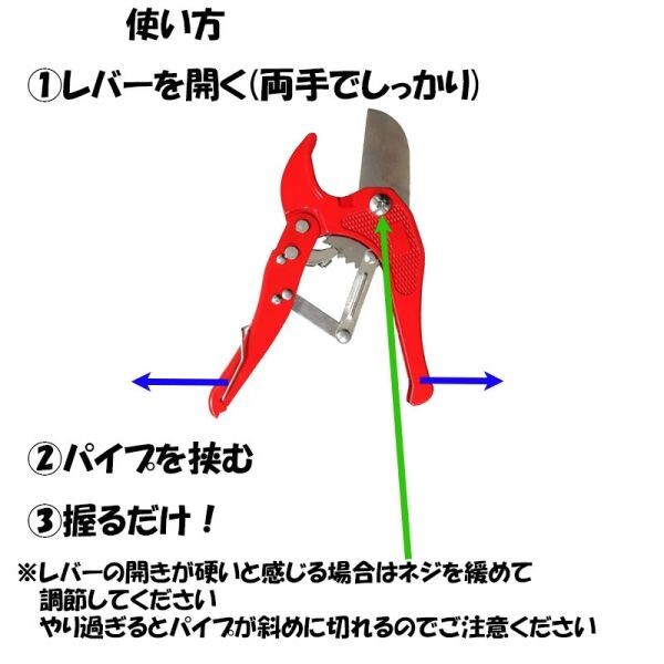 | 商品説明 | DIY界ではおなじみの塩ビカッターです ラチェット式で塩ビ管の切断が簡単です しっかりとした剛性もあります 初めてパイプカッターを使用される方は 切れ味に驚くと思いますよ 長期間使用されない時は 刃に薄く油をなじませておくと 長持ちしますよ 塩ビパイプ用のエンビカッター