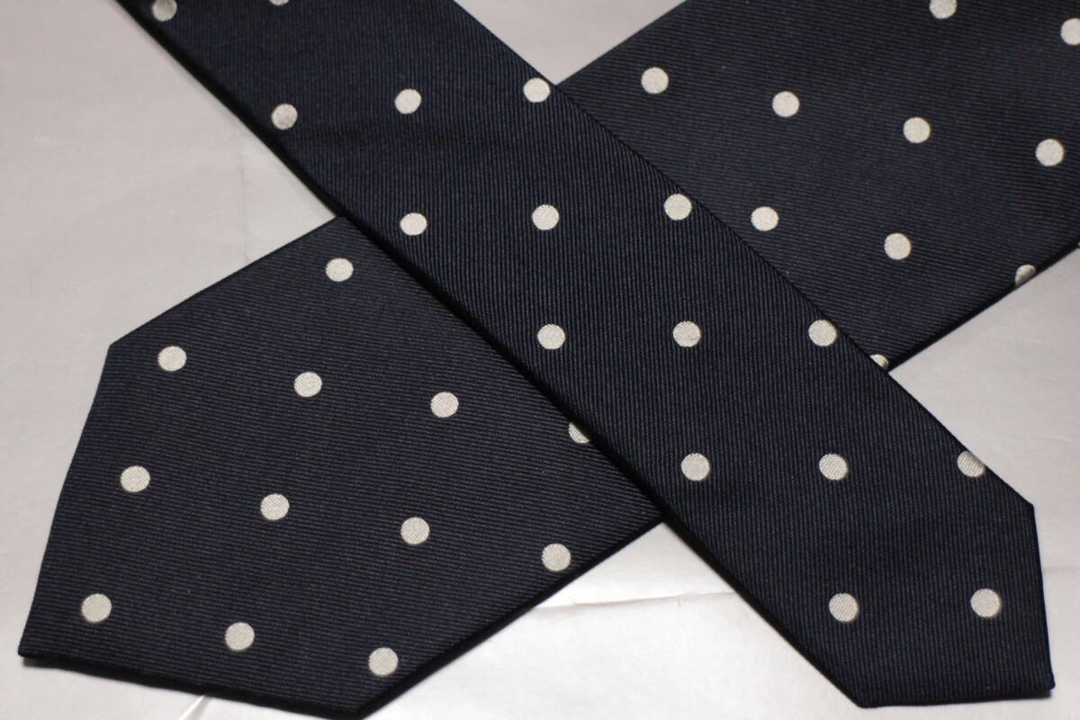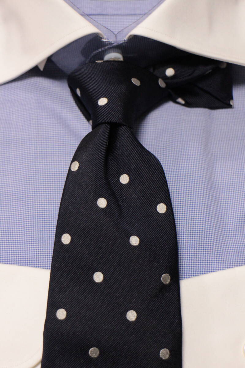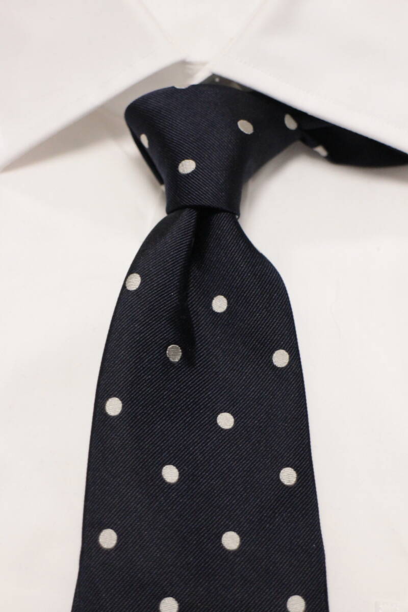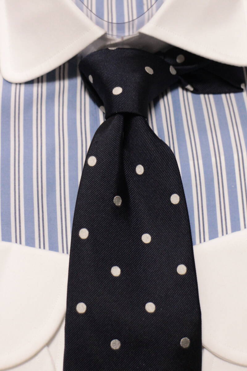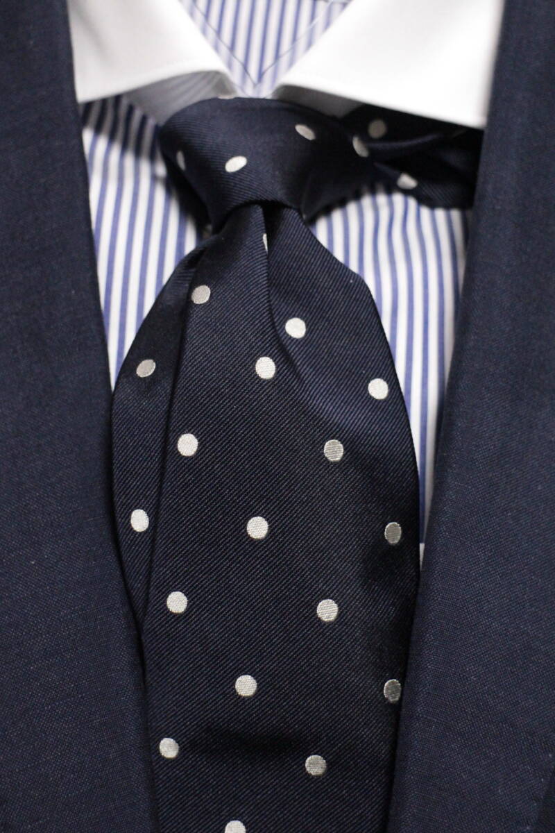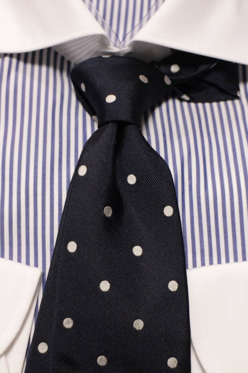 タイです。ネイビーのドットタイは、ワードローブに必須の一本。世界共通で