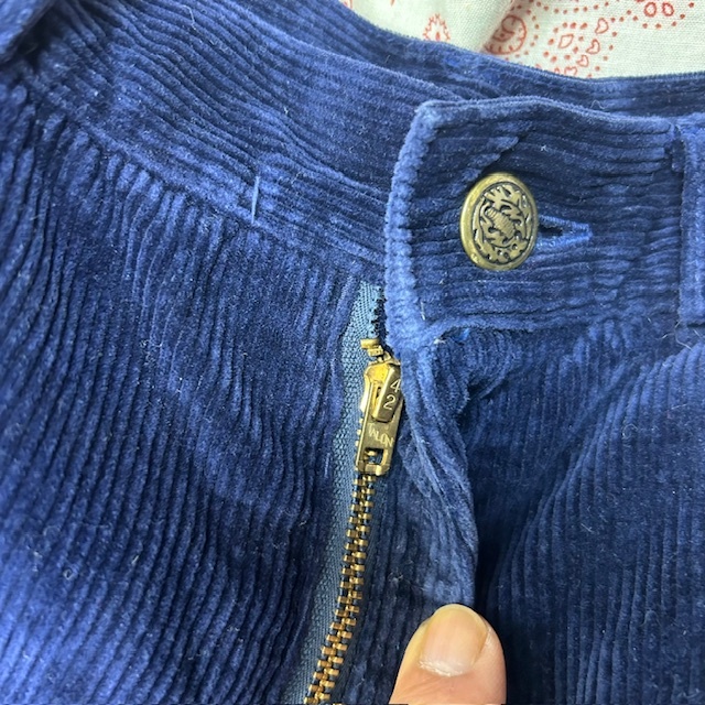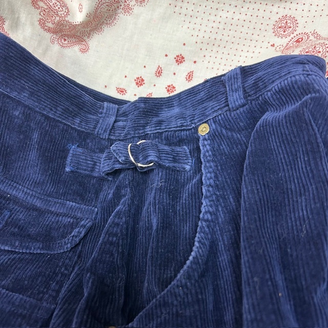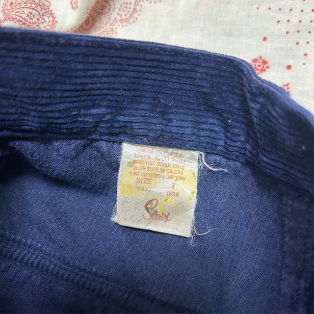 ●商品説明・・・アメリカ古着になります。70年代~80年代頃のオールド・ヴィンテージのシアーズのゆったりしたお尻・太股周りから裾にかけてストンとした感じの、バギーのような全体的に程よくゆったりしたシルエットの中太畝のコーデュロイパンツです。ジッパーは42TALONで、ウエストは両サイドベルトで絞れるようになっています。ボリューム感があるのでサスペンダーで吊っても可愛いと思います。素材はコットンで、色は濃紺(ダークネイビー)です。サイズ表記はUSA 7で、当時のやや小さめなウエストで、ウエスト的にXS~S程度のサイズ感かと思います。