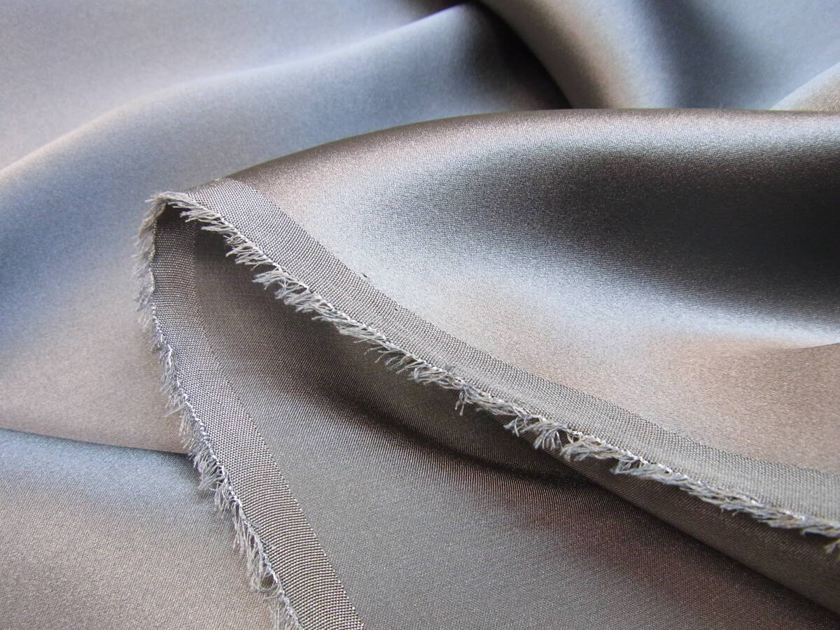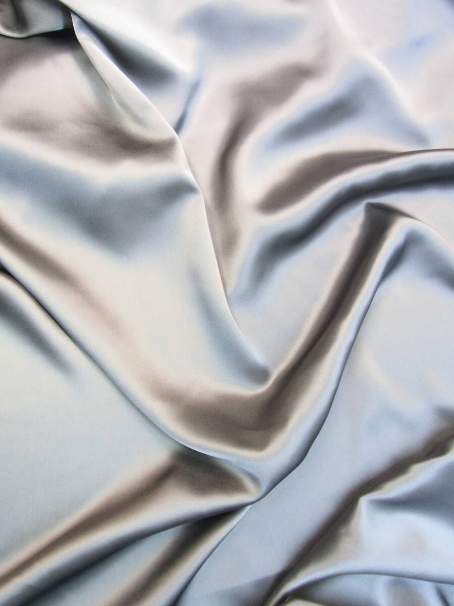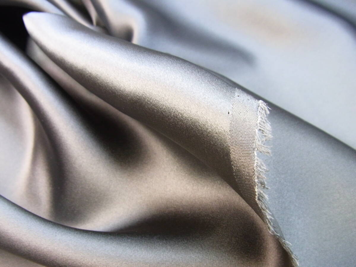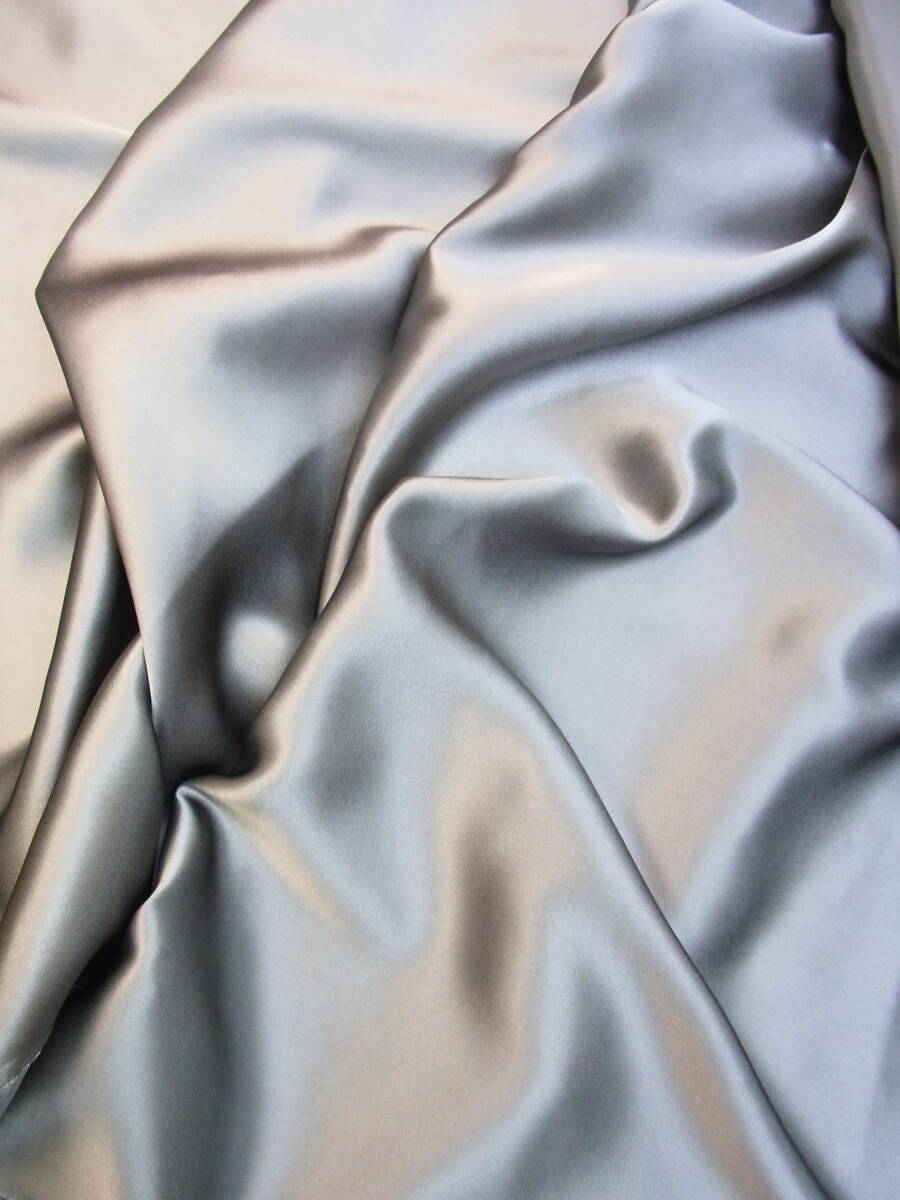 グレー色本絹サテンです縫製工場の在庫残反です、ご理解のある方お願いいたします折りたたんでの発送になります(多少シワになりますがご了承ください)。生地幅約112センチ、長さ約2メーターです不明点はご質問ください